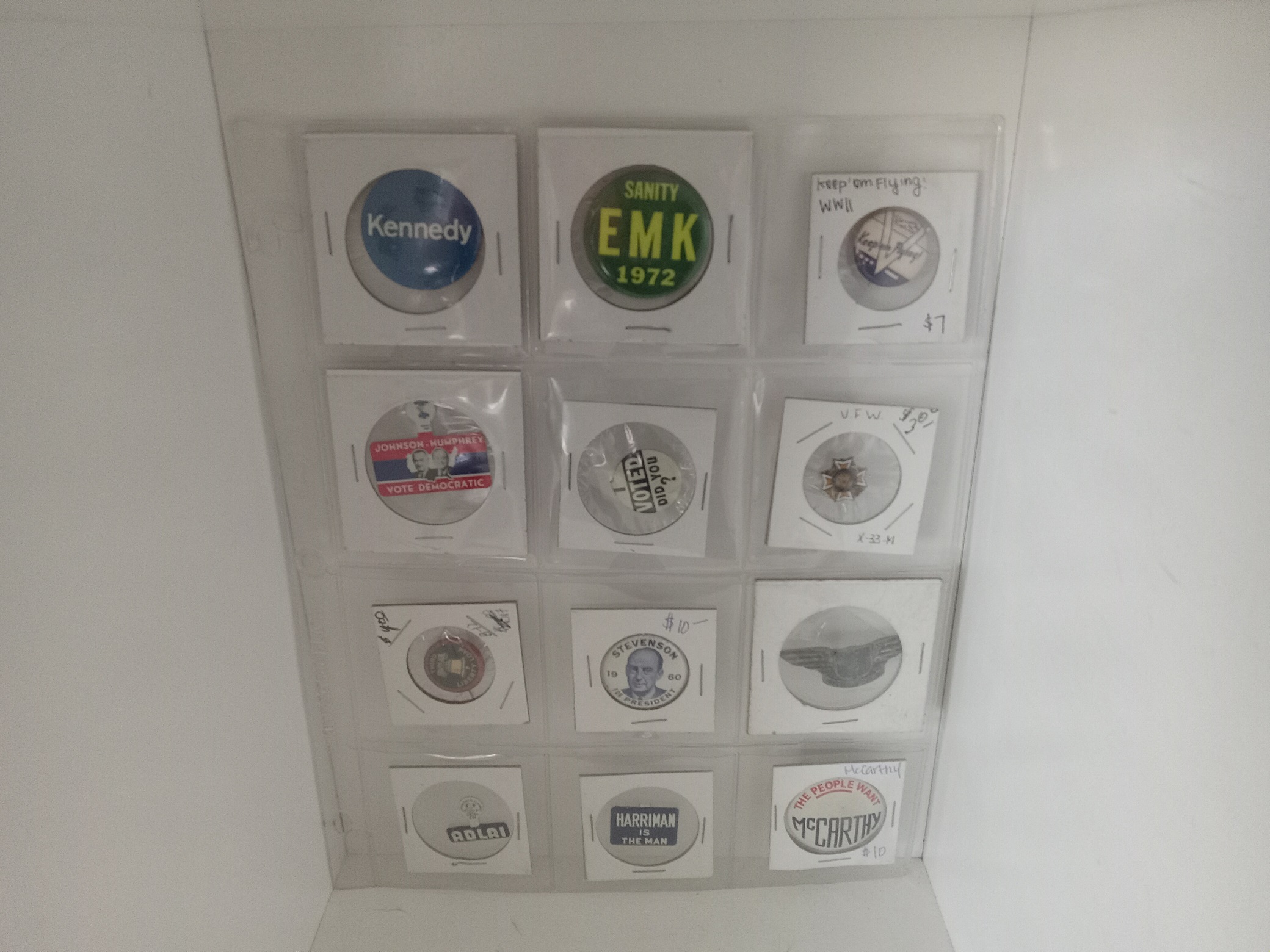 12 pins of varying conditions. Some pins have some wear from age and may have lost any paint they once had.