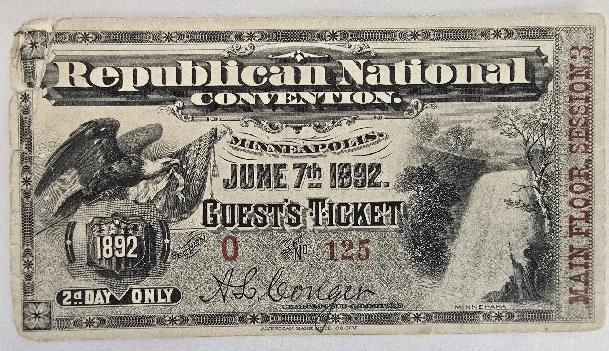 1892 — Republican National Convention — Guest’s Ticket — June 7th, 1892 Minneapolis