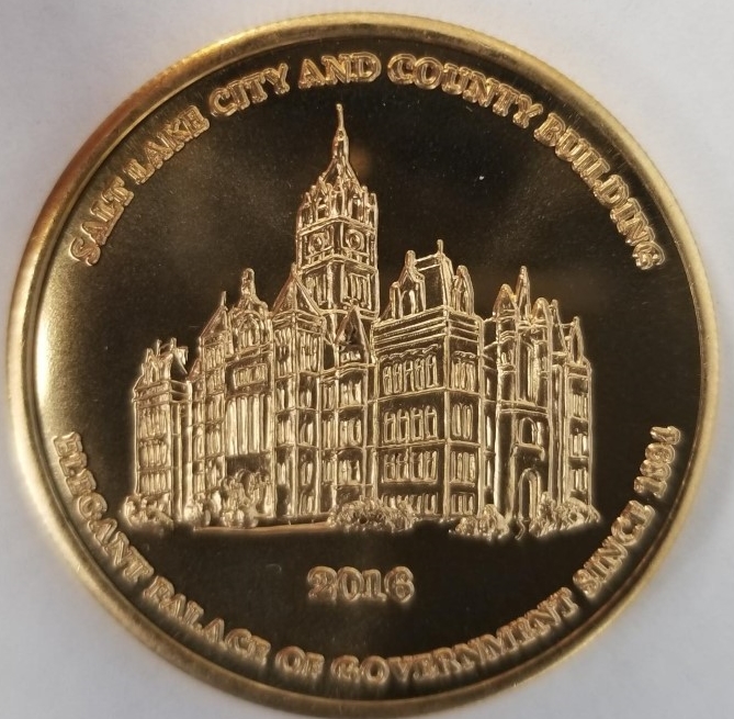 2016 — Salt Lake City and County Building — “Elegant Palace of Government Since 1894” — National Utah Token Society — Gold-Colored Coin