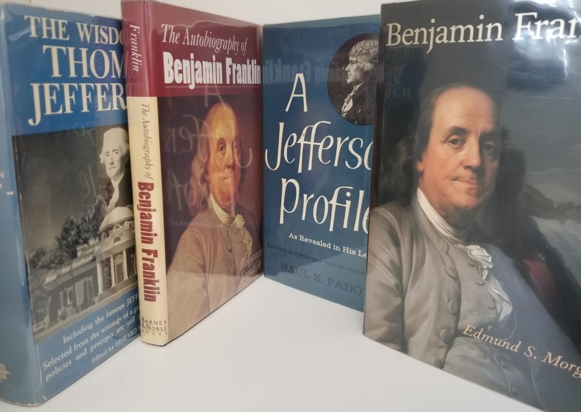 4 Books About Benjamin Franklin & Thomas Jefferson — Benjamin Franklin by Edmund S. Morgan / A Jefferson Profile by Saul K. Padover / The Autobiography of Benjamin Franklin / The Wisdom of Thomas Jefferson by Edward Boykin
