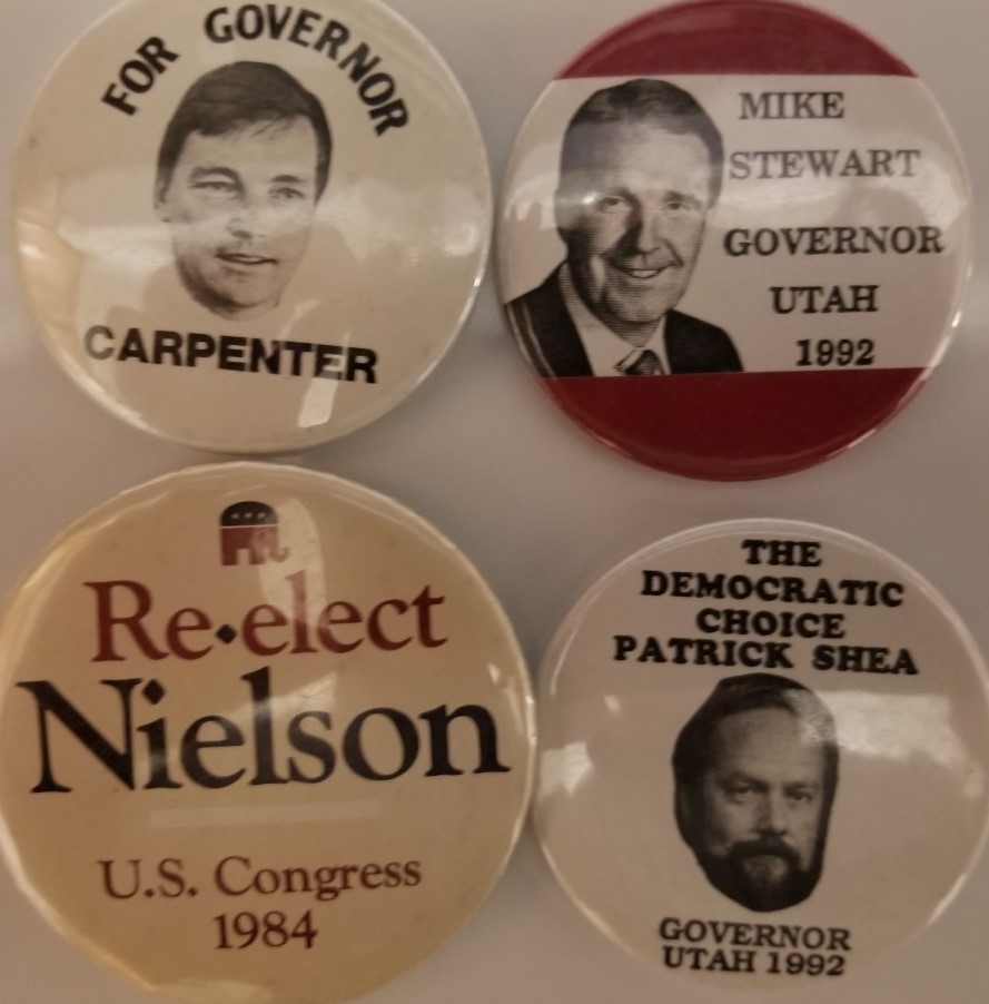 / 4 Utah Political Pins ~ Patrick Shea, Mike Stewart, Nielson, Carpenter