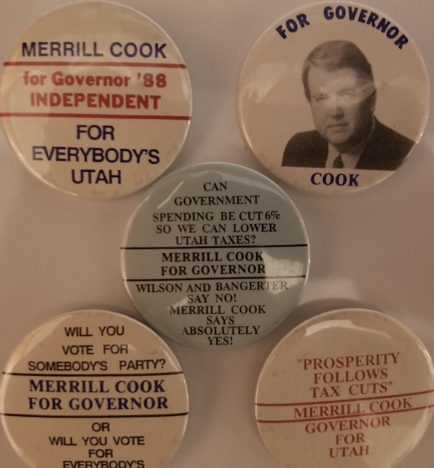 These five pins, each measuring about 2 inches across; all in very good condition. Merrill Cook was a Utah Politician, or at least wanted to be real bad!