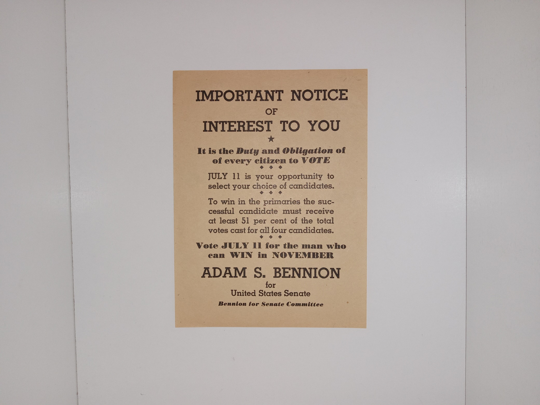 Election Flyer for the Campaign of Adam S. Bennion for United States Senate