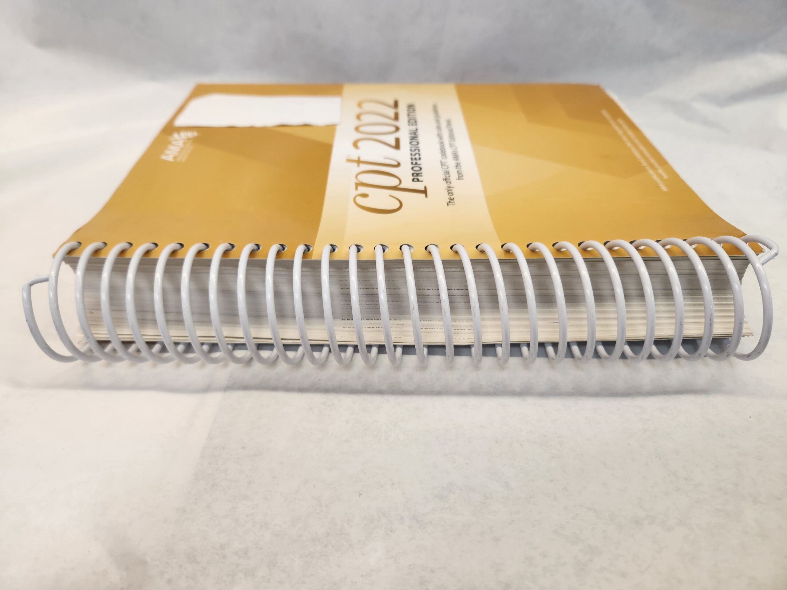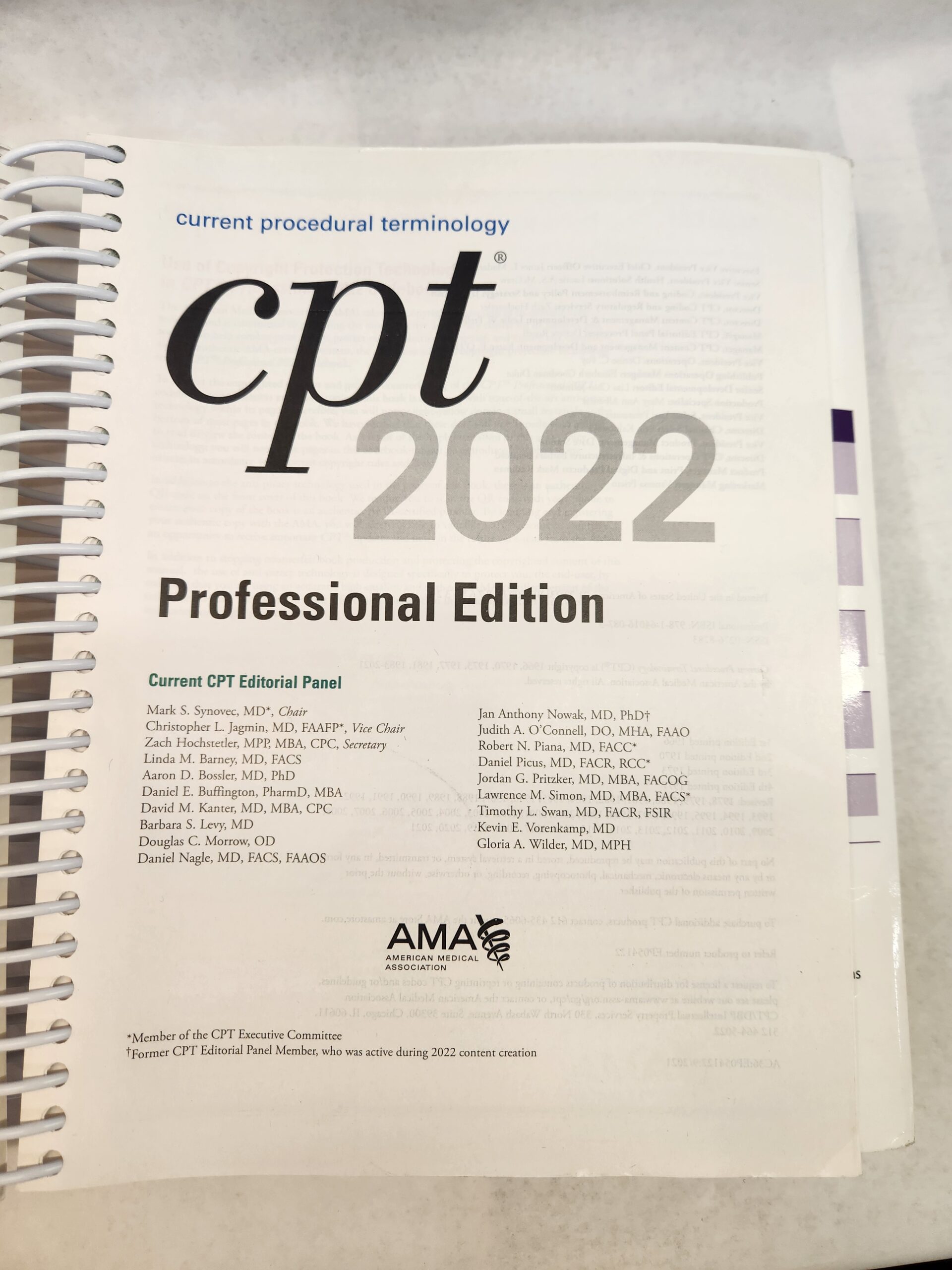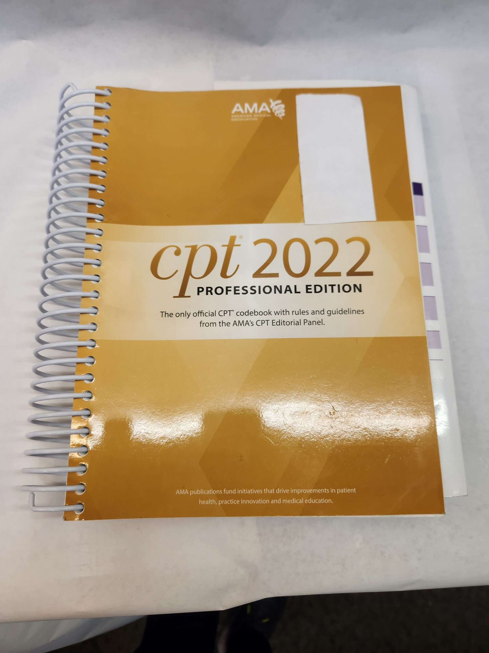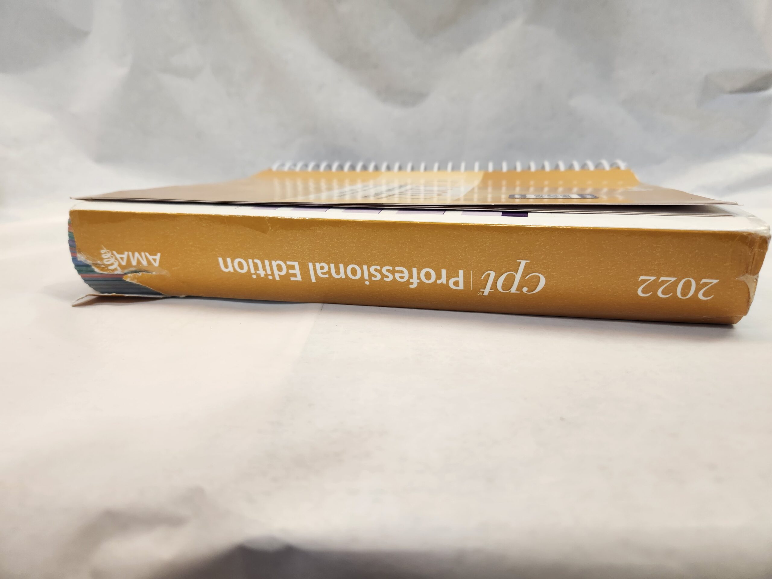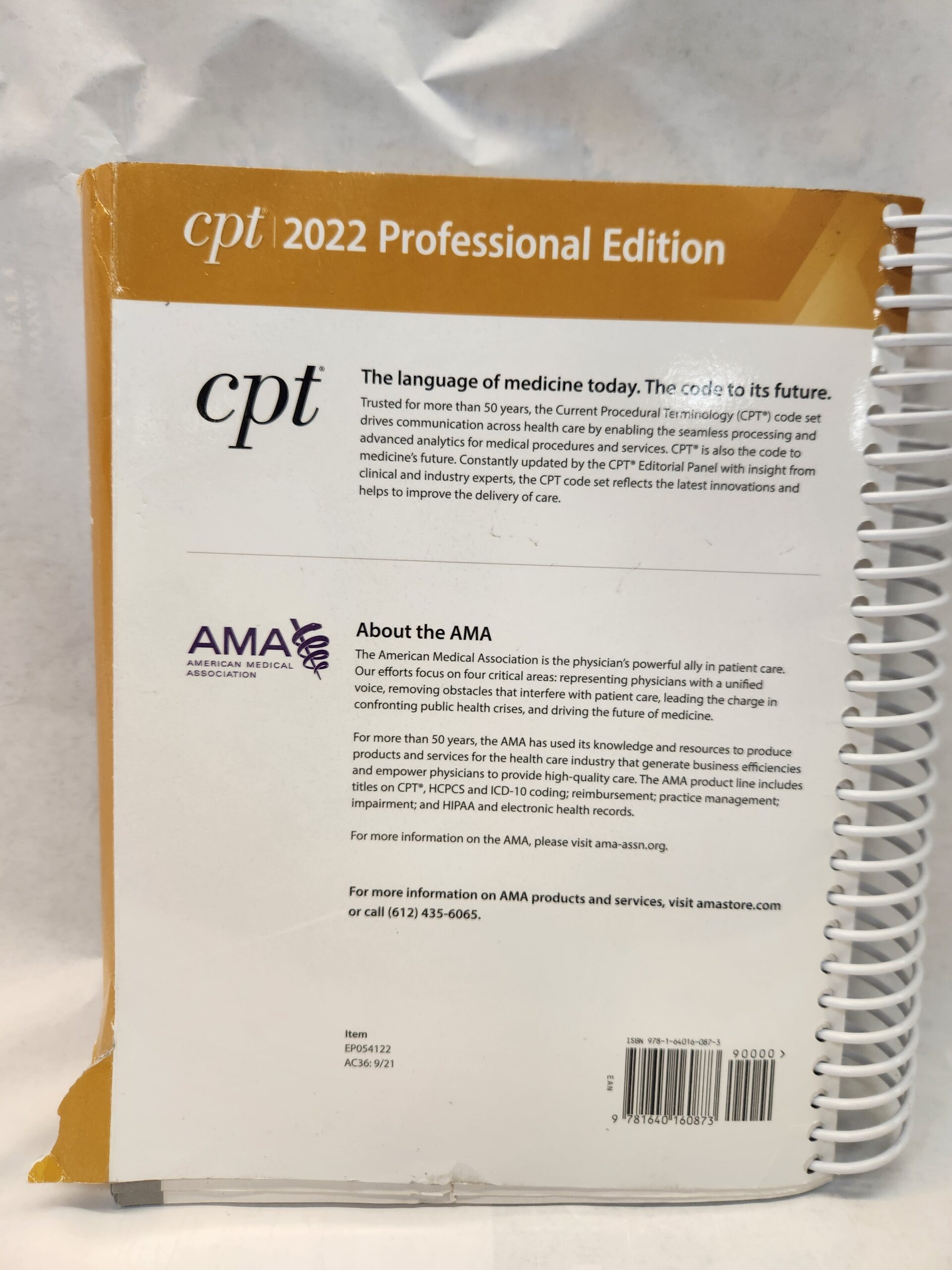 cpt 2022 Professional Edition:: The only official CPT codebook with rules and guidelines from the AMA’s CPT Editorial Panel (White Spiral Bound) No marks or writings on pages. Corners and edges show moderate shelf wear with bents, scuffs, and a tear on back end. Binding is good. Cover, front and back, has some light scratch marks.