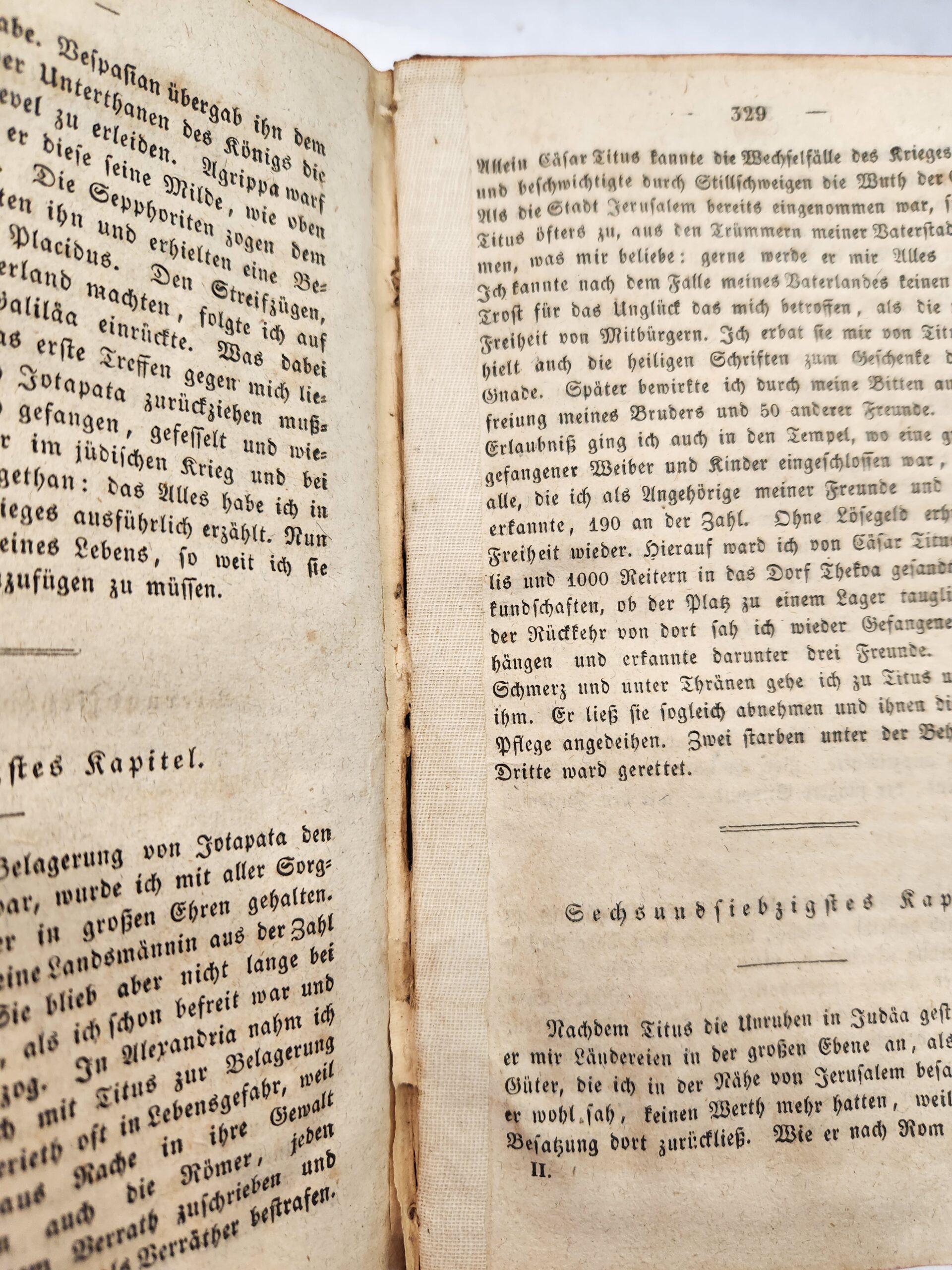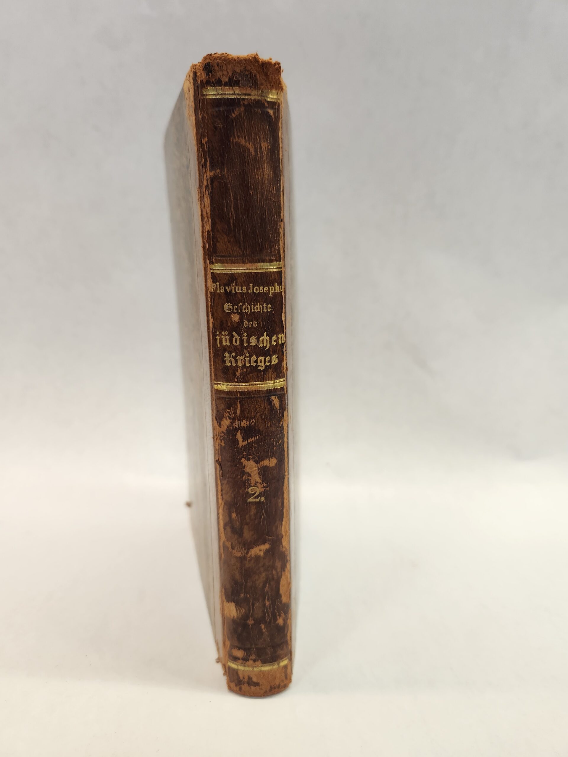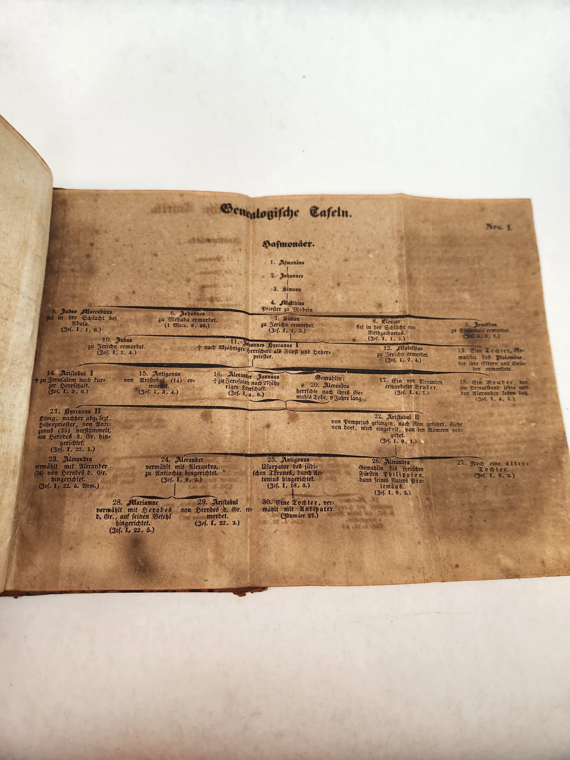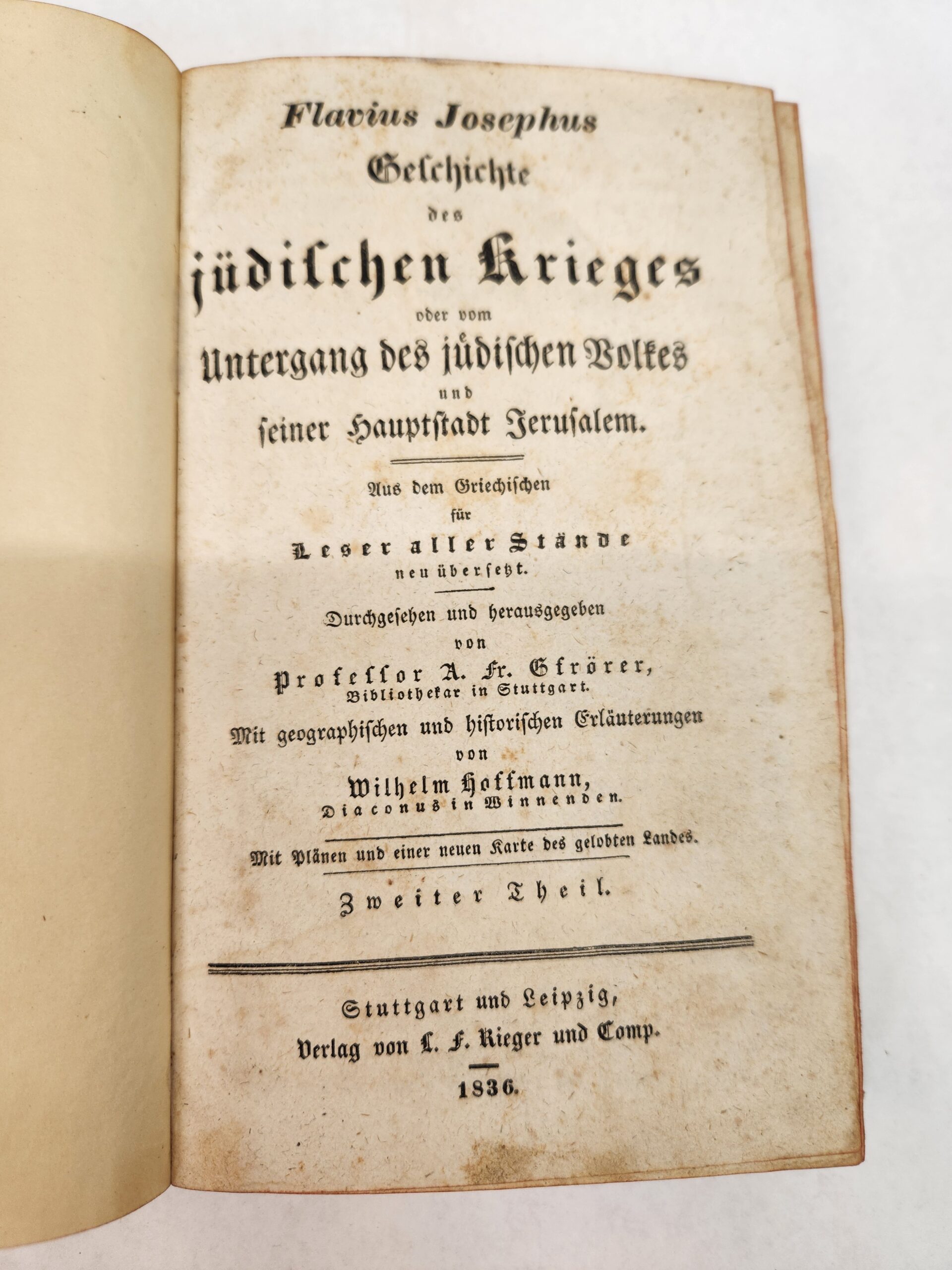 Works of Flavius Josephus (Old German, 1836, Hardcover) No marks or writing on pages (only age marks), except for a previous owner’s stamp inside of front cover. Binding is good but there are a couple places where the binding is loosening. Corners and edges show wear with scuffs, bends/dings/dents, and small tears/flaking. Couple maps added in, see pictures in gallery.