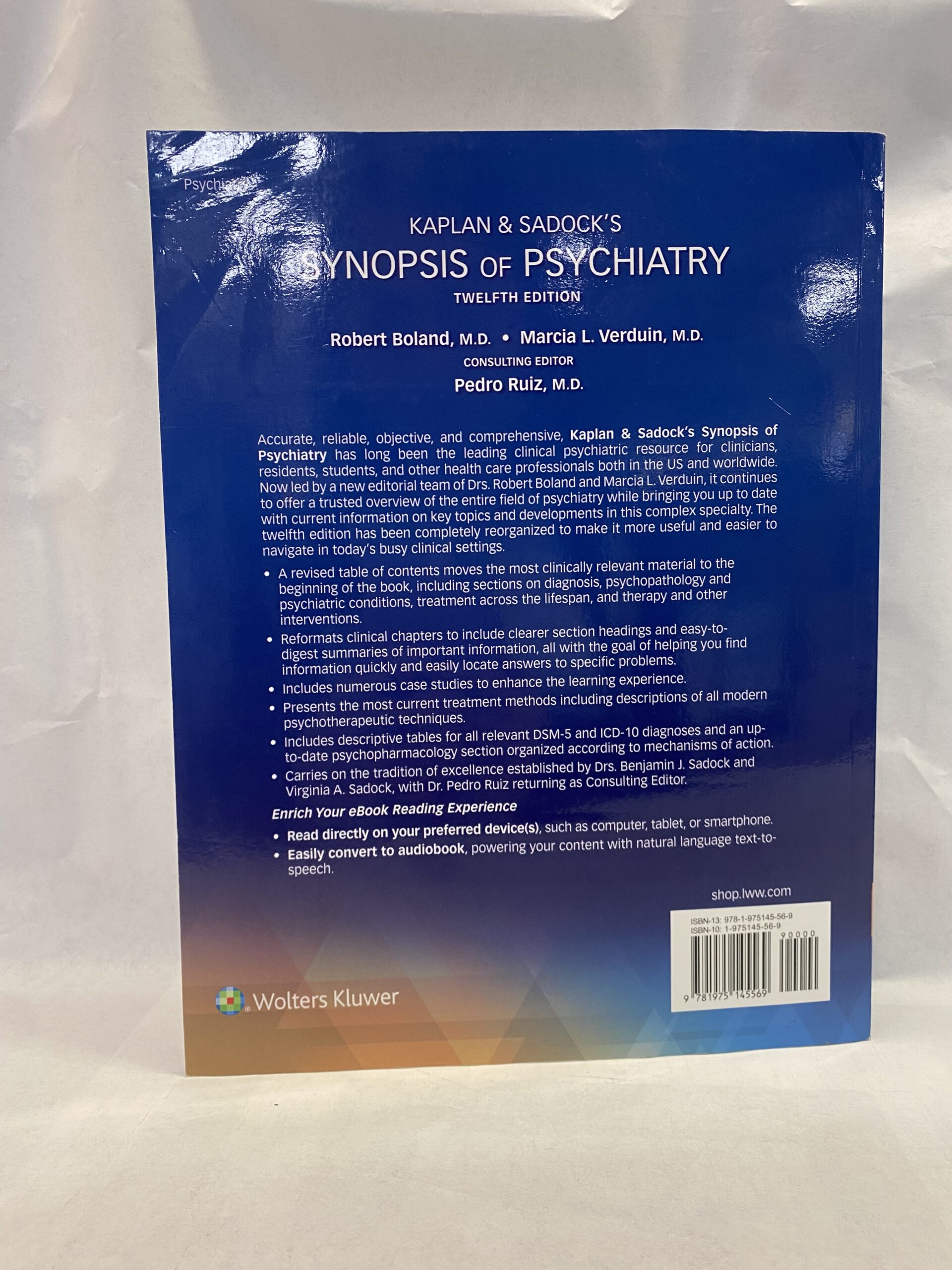 Kaplan and Sadock’s Synopsis of Psychiatry Twelfth Edition by Robert Boland and Marcia L. Verduin with consulting editor Pedro Ruiz. Paperback, 2022.