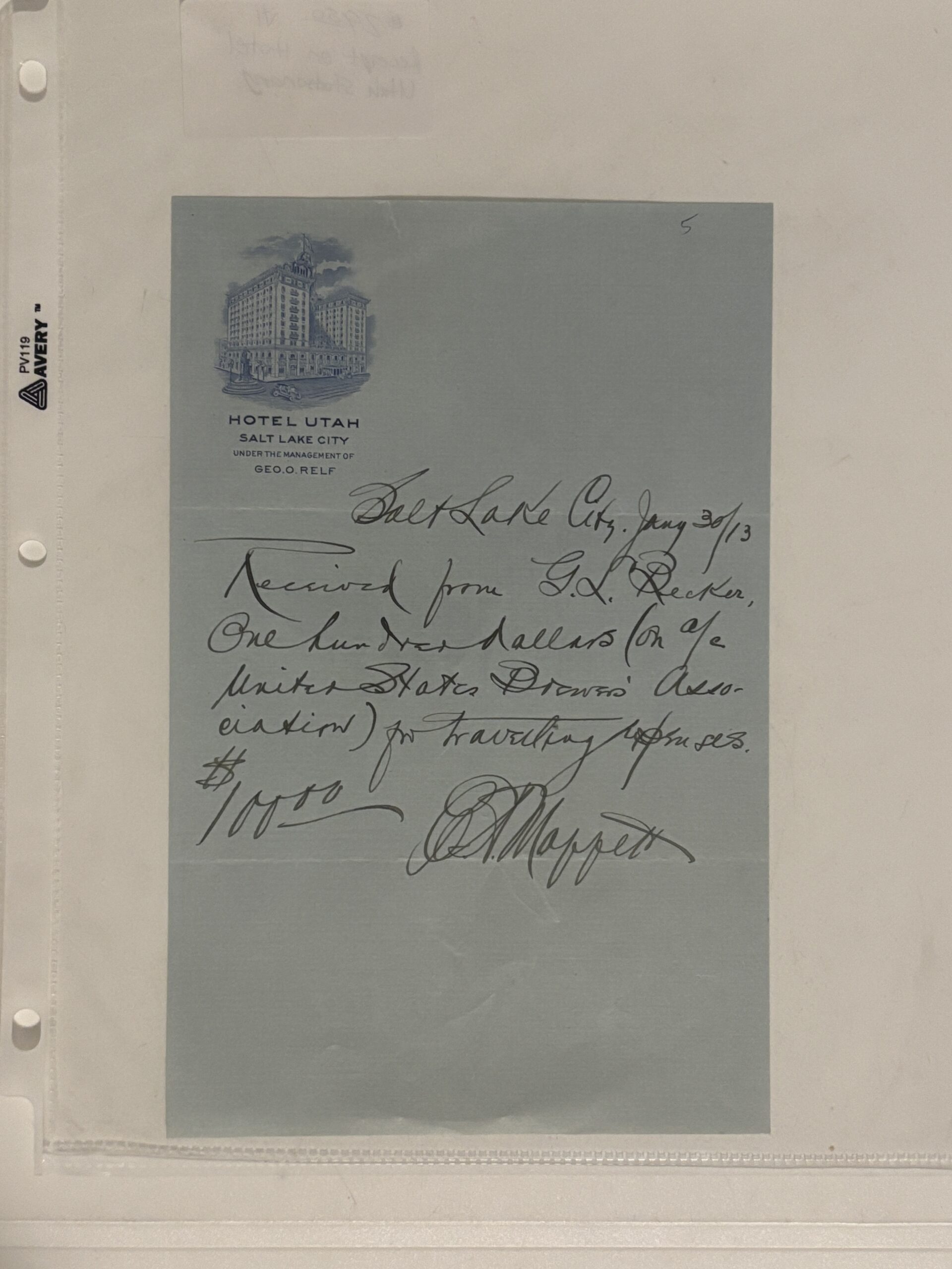 Receipt on Hotel Utah Stationary