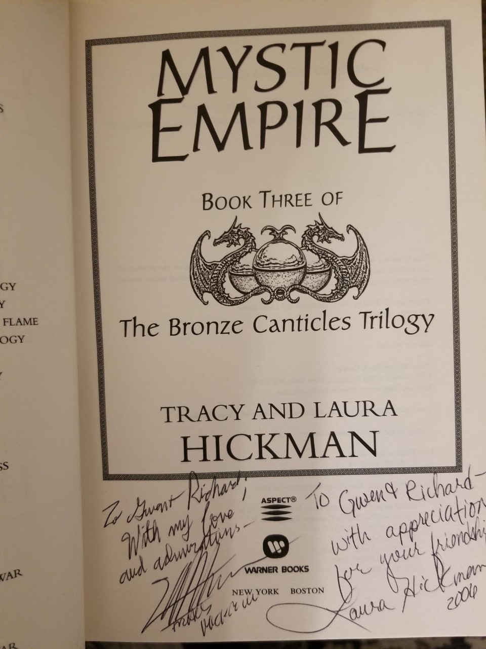 The Bronze Canticles Complete Set: Mystic Warrior, Mystic Quest, Mystic Empire — Inscribed by Authors Tracy & Laura Hickman to LDS Film Maker Richard Dutcher & His Wife Gwen