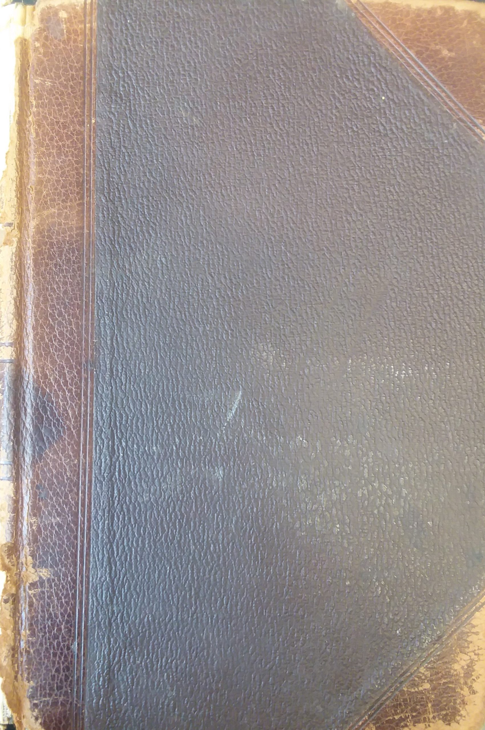 Brown leather hardcover. Scuffs and scrapes and major shelf wear on both covers. The spine is largely missing and the covers are barely holding on. Some pencil markings on the first page, but otherwise the text throughout is clean, clear, and legible. In fair condition.