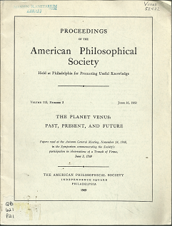 Proceedings of the Americal Philosophical Society (June 16, 1969, Vol. 113, No. 3): The Planet Venus: Past, Present, and Future