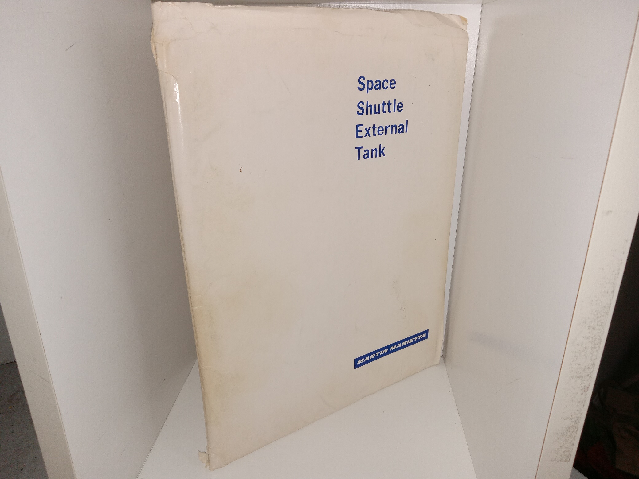 Fair condition pair of thin softcovers kept within a custom, white folder. The folder has tears, wrinkling, creases, stains, and gray scuff marks. The books have some yellowing. One page has writing in pencil.