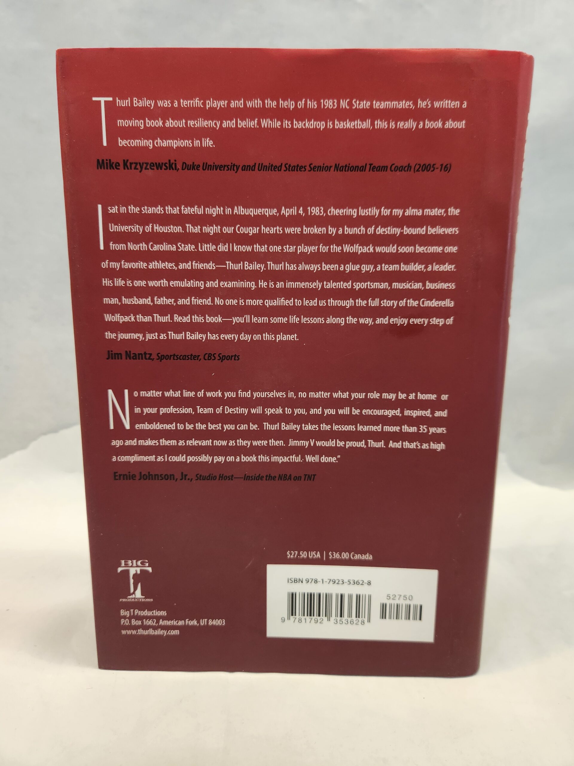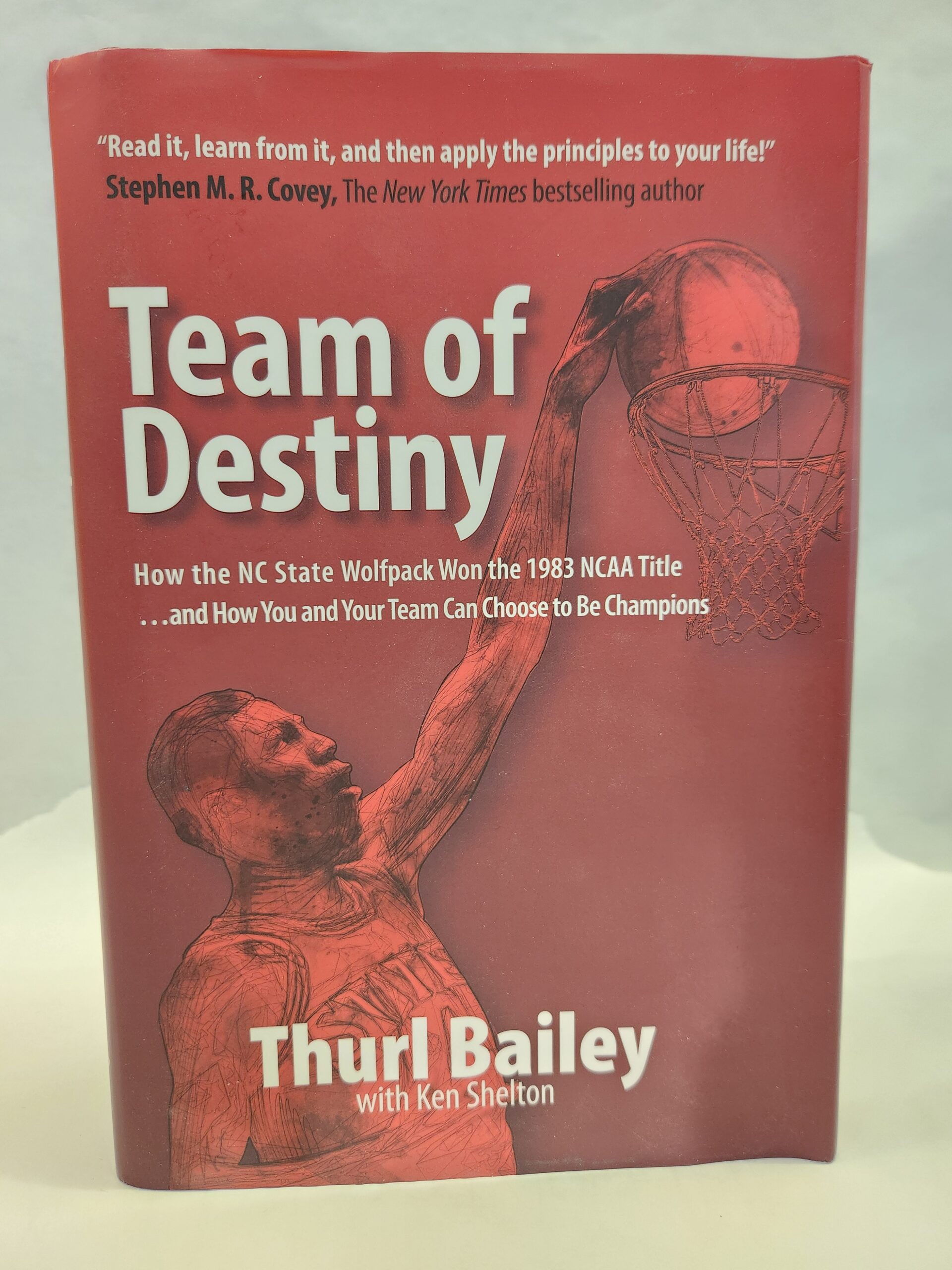 Team of Destiny:: How the NC State Wolfpack Won the 1983 NCAA Title… and How You and Your Team Can Choose to Be Champions (Signed, Hardcover w/ Dust Jacket) No marks or writing on pages, except for the signature on first blank page. Binding is good. Corners and edges show minimal shelf wear. Dust jacket is slightly warped so will not sit right in book.