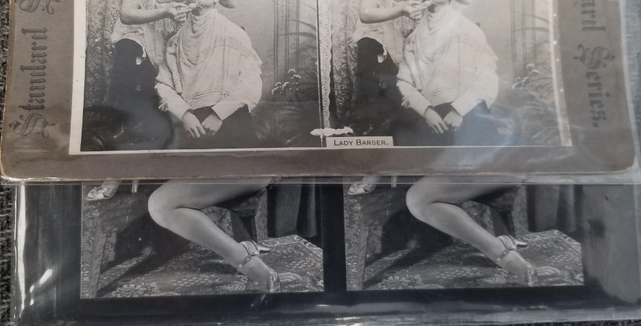 We didn’t want to show everything on these two stereoviews! One is of a naked lady; the other is of a lady barber shaving a man, with her top open. Both are in pretty good condition; one says “Standard Series” on it and the other says nothing at all, front or back.