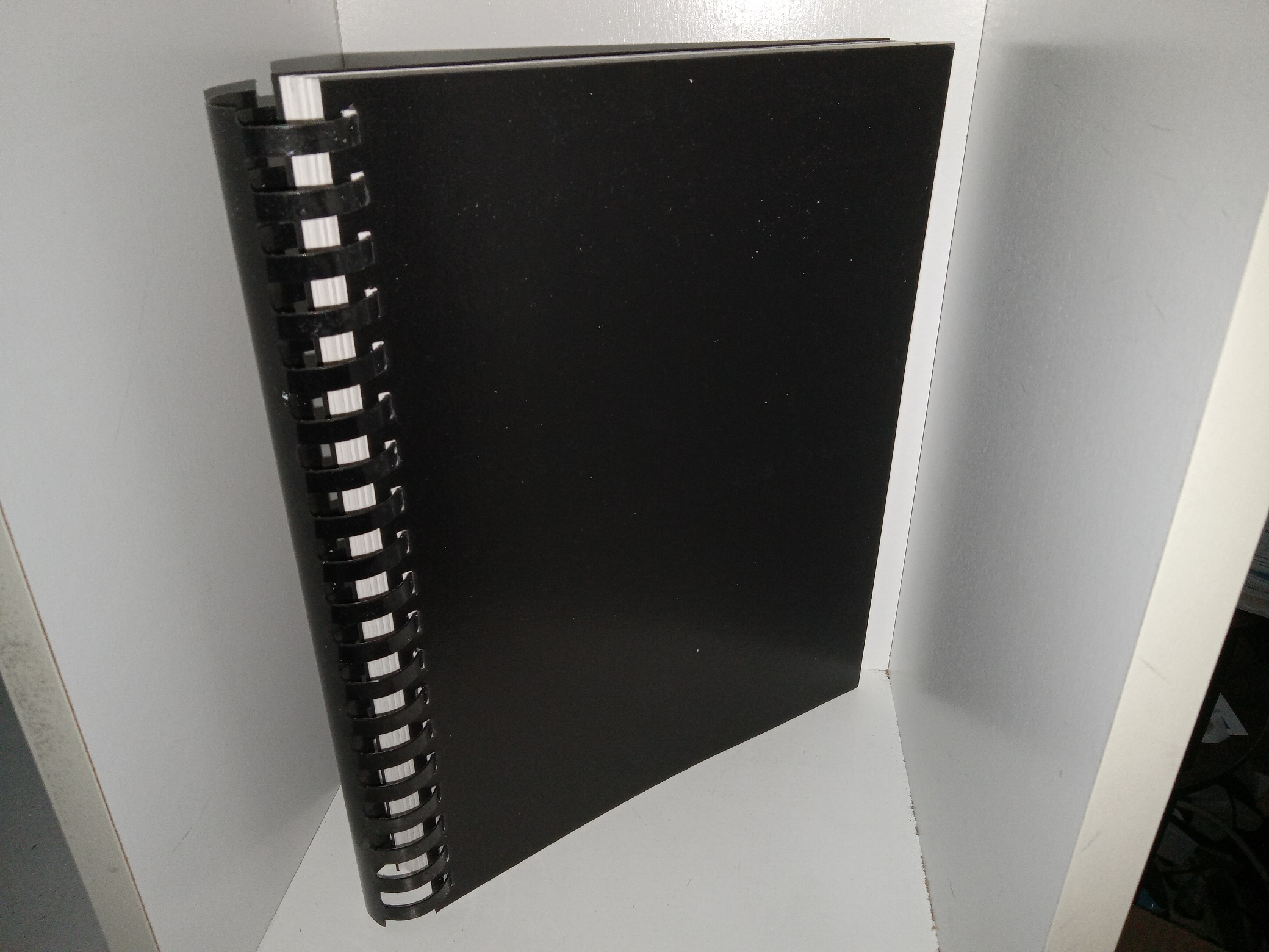 Good condition, large, black softcover with no title printed on the covers, and with a black comb binding. The cover has some scuff marks. The first page has writing in pencil, and eraser marks. Text throughout is clean, clear, and legible.