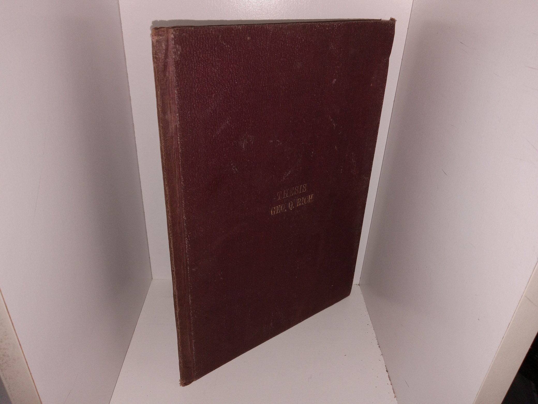 Fair condition, large, thin, burgundy hardcover with no dust jacket. The cover has heavy scuffing, fading, scratches, crushed corners, small tears, and fraying. The internal binding is torn. Some pages have stains, wrinkles, tears, or marks or writing in pen. The inside covers have heavy wrinkling. The title page has writing in pencil.
