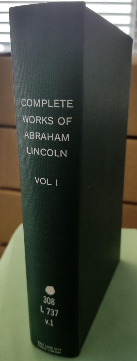 This rare 4-page pamphlet is bound towards the front of this Volume One of THE COMPLETE WORKS OF ABRAHAM LINCOLN, which was re-bound in a library type binding, as pictured.