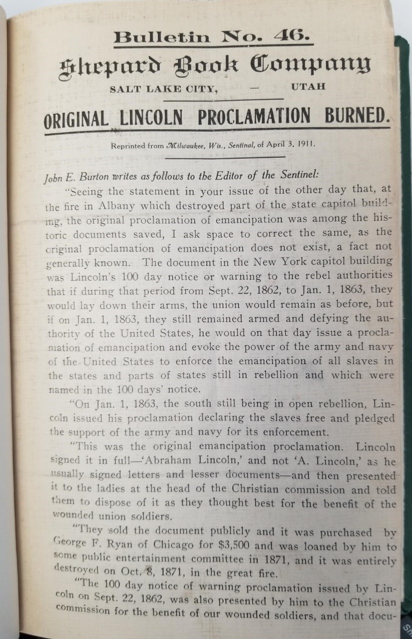 1911 — Rare Utah Pamphlet — Bulletin No. 46. Shepard Book Company, Original Lincoln Proclamation Burned — Bound Inside Vol. 1 of The Complete Works of Abraham Lincoln