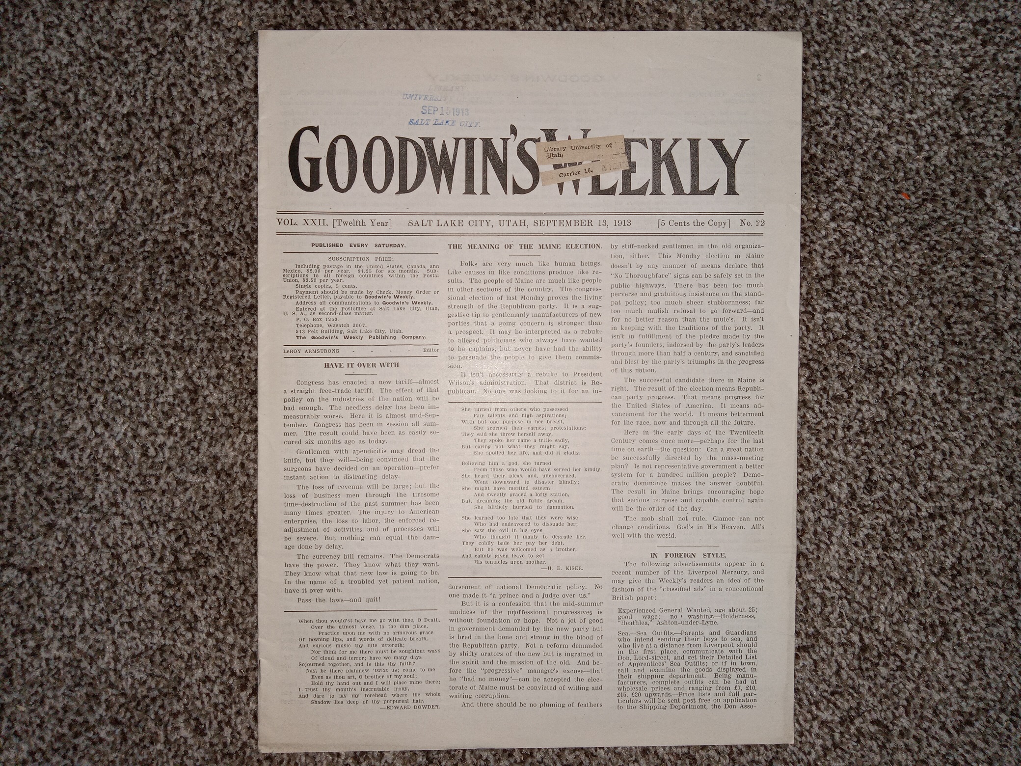 Goodwin’s Weekly: Vol. 22 [Twelfth Year], No. 22, Salt Lake City, Utah, September 13, 1913