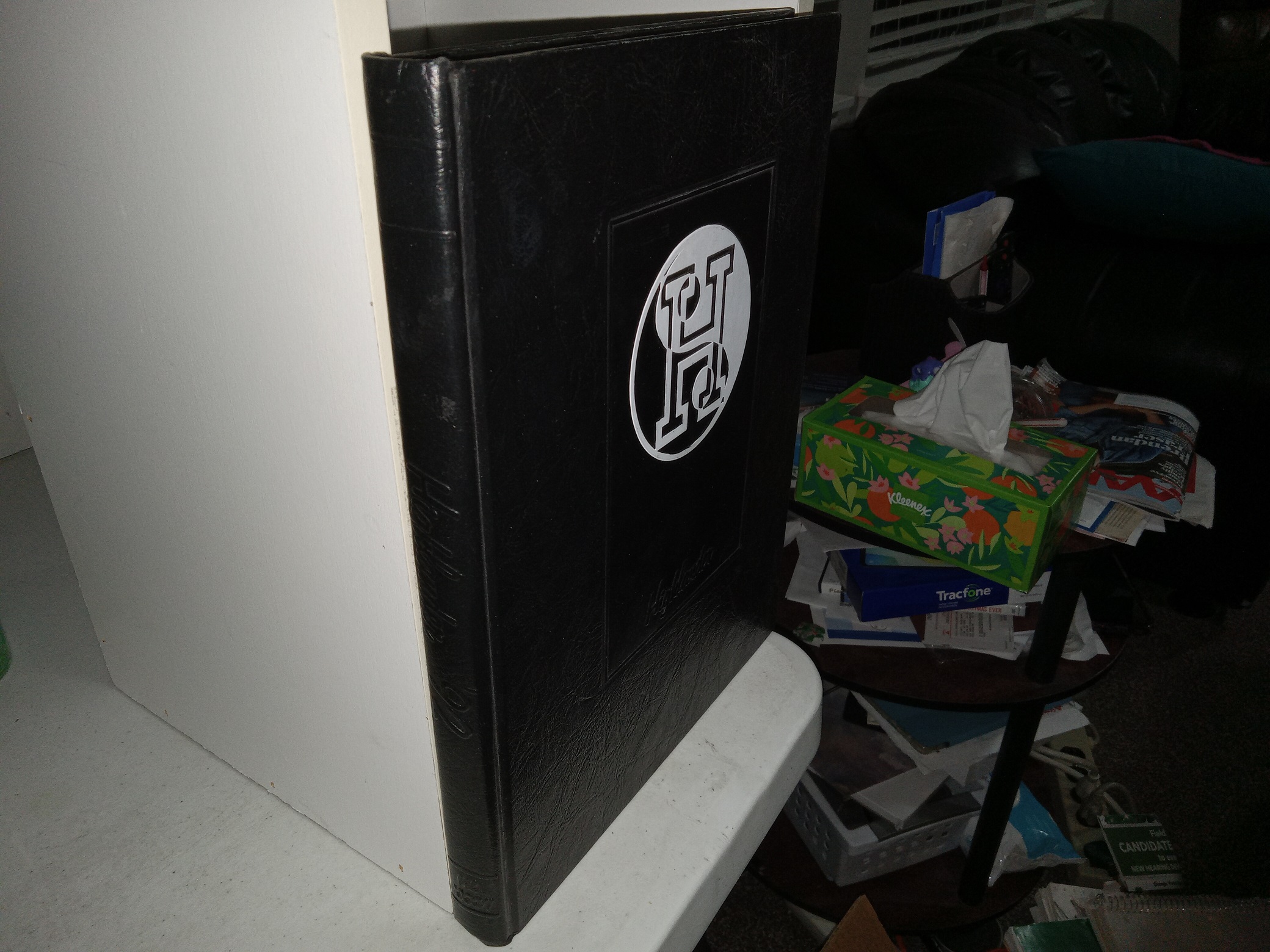 Good condition, large, black hardcover with no dust jacket. The cover has some residue, and some minor scuffing. The boo is filled with signatures and inscriptions written to the previous owner in pen and marker. The title page has been mostly torn from the binding, and tape has been applied to some of said page. The first page and the title page have writing in pencil and eraser marks.