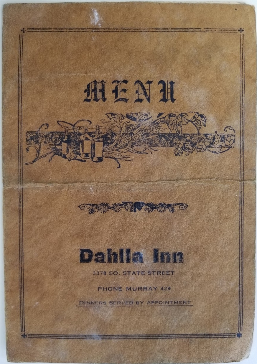 Menu ~ Dahlla Inn ~ 3378 So. State Street, Phone Murray 429, Dinners Served by Appointment