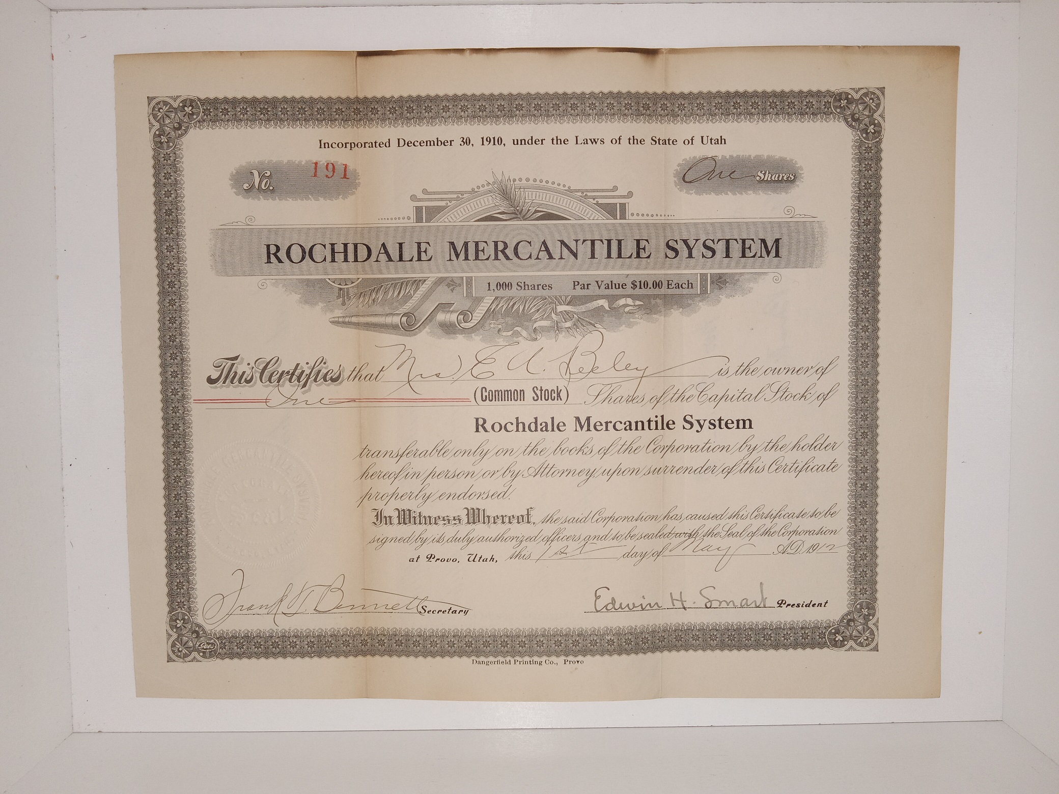 Rochdale Mercantile System Utah Stock Certificate