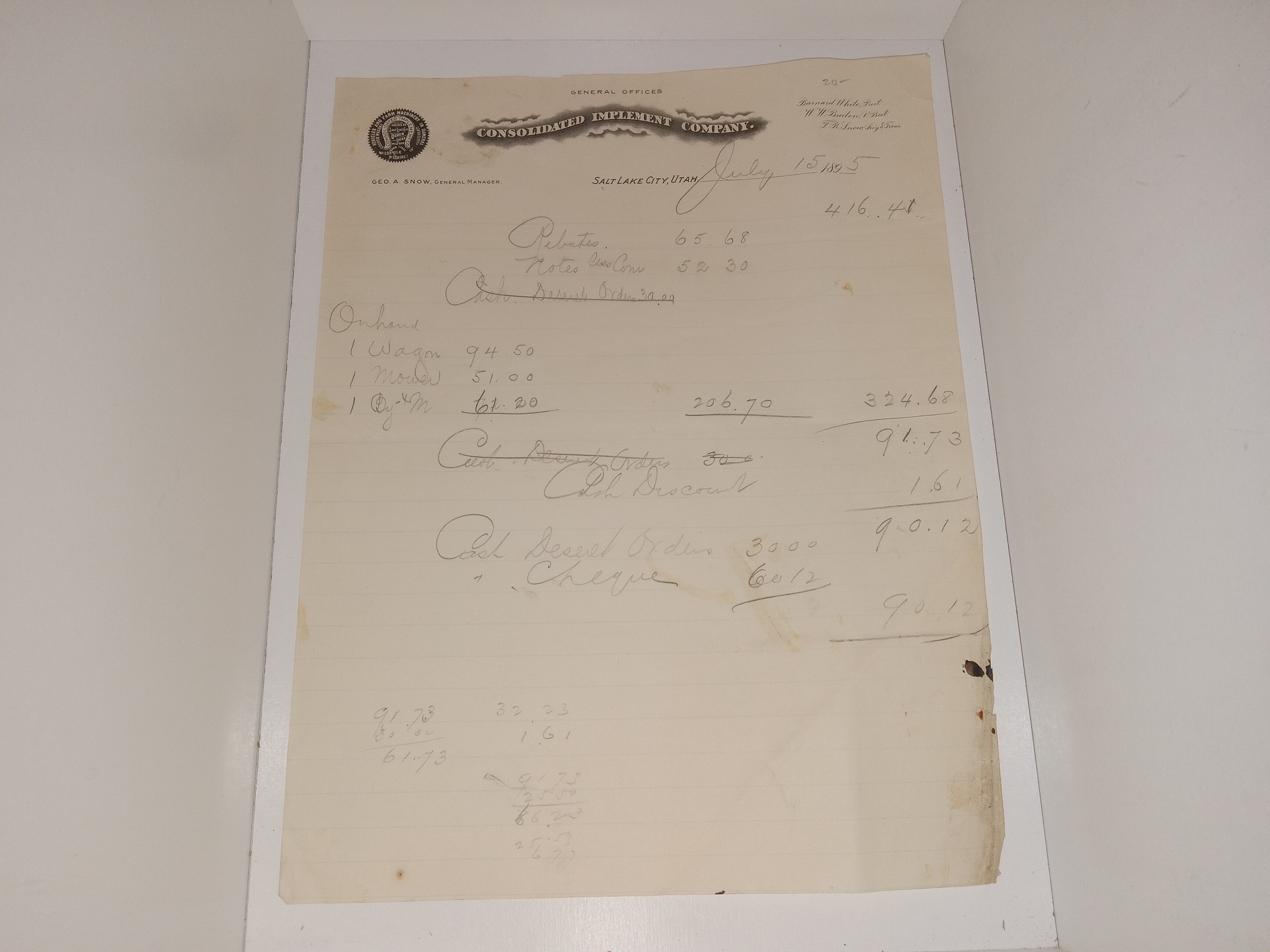 Single Sheet Notes on Company Stationary: Consolidated Implement Company, Salt Lake City, Utah