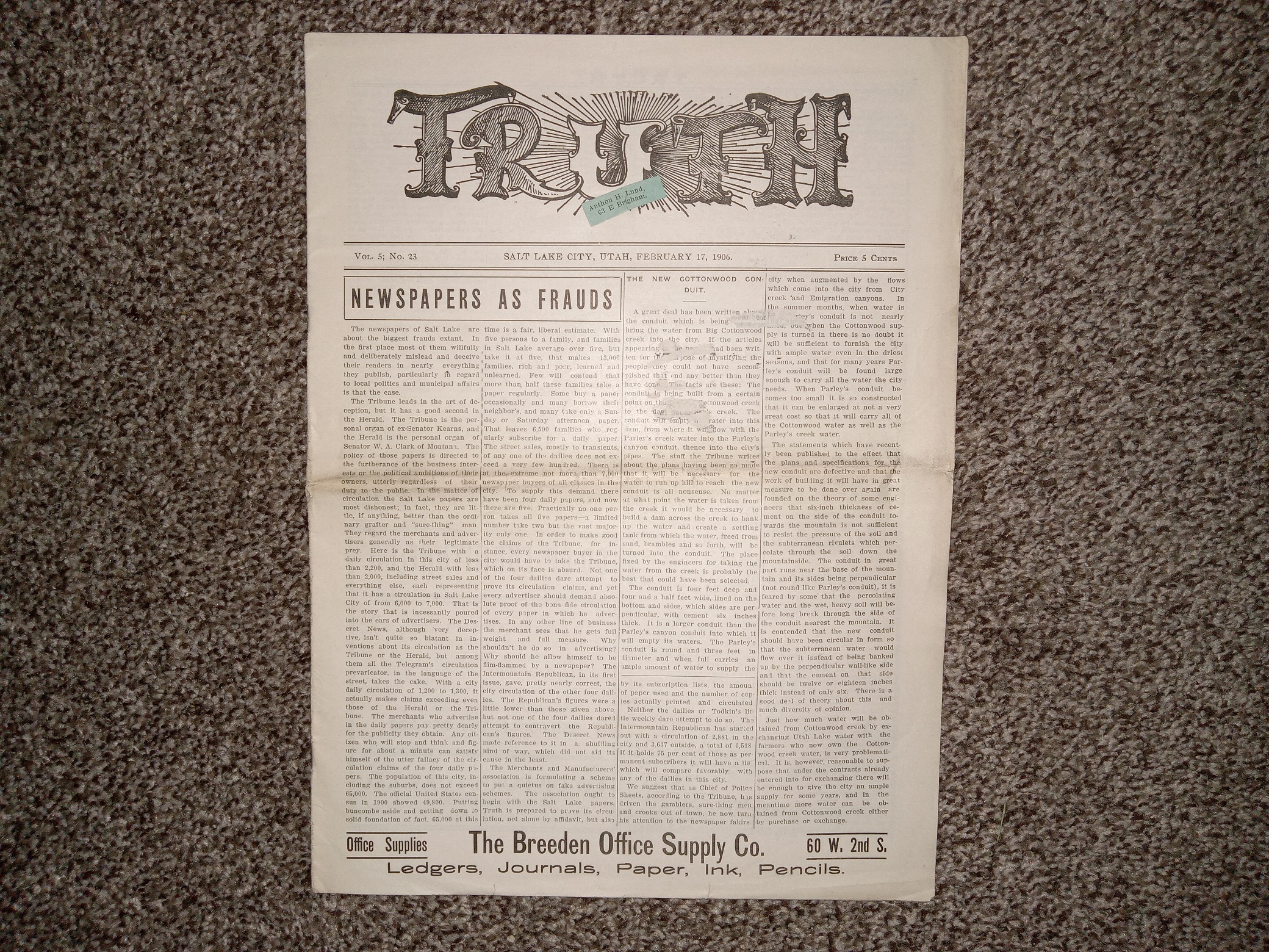 Truth: Vol. 5, No. 23, Salt Lake City, Utah, February 17, 1906