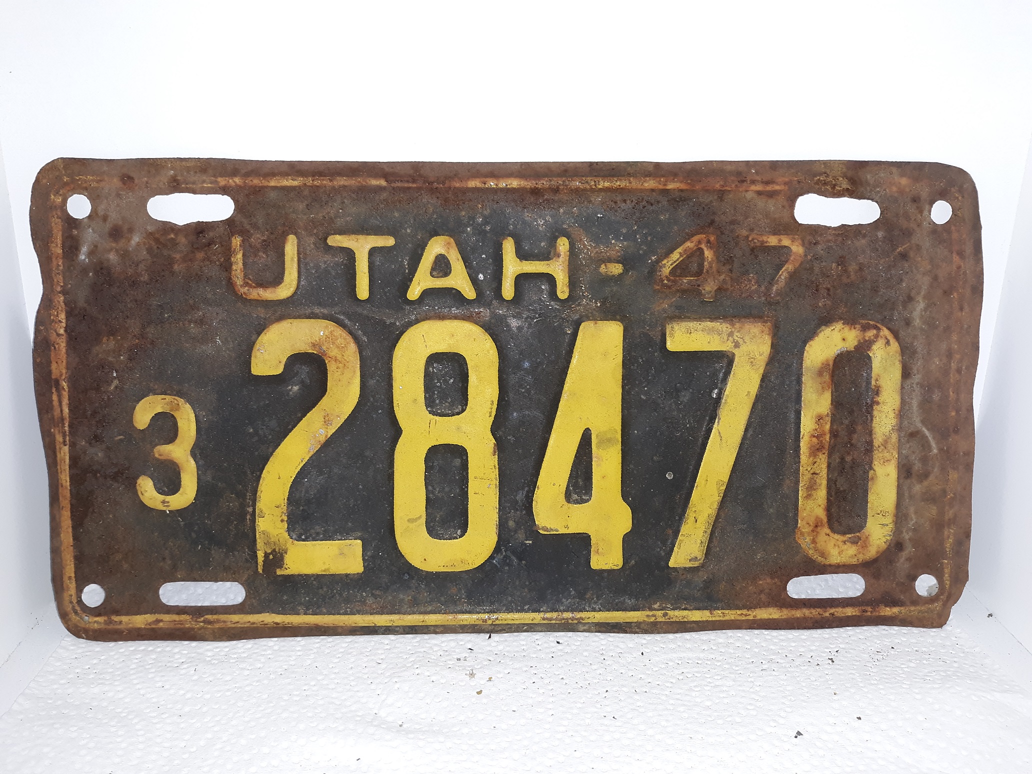 Old and heavily rusted license plate from Utah in 1947, numbered 328470. Black with heavy rusting along 3 edges……………….v120 Bx1580B