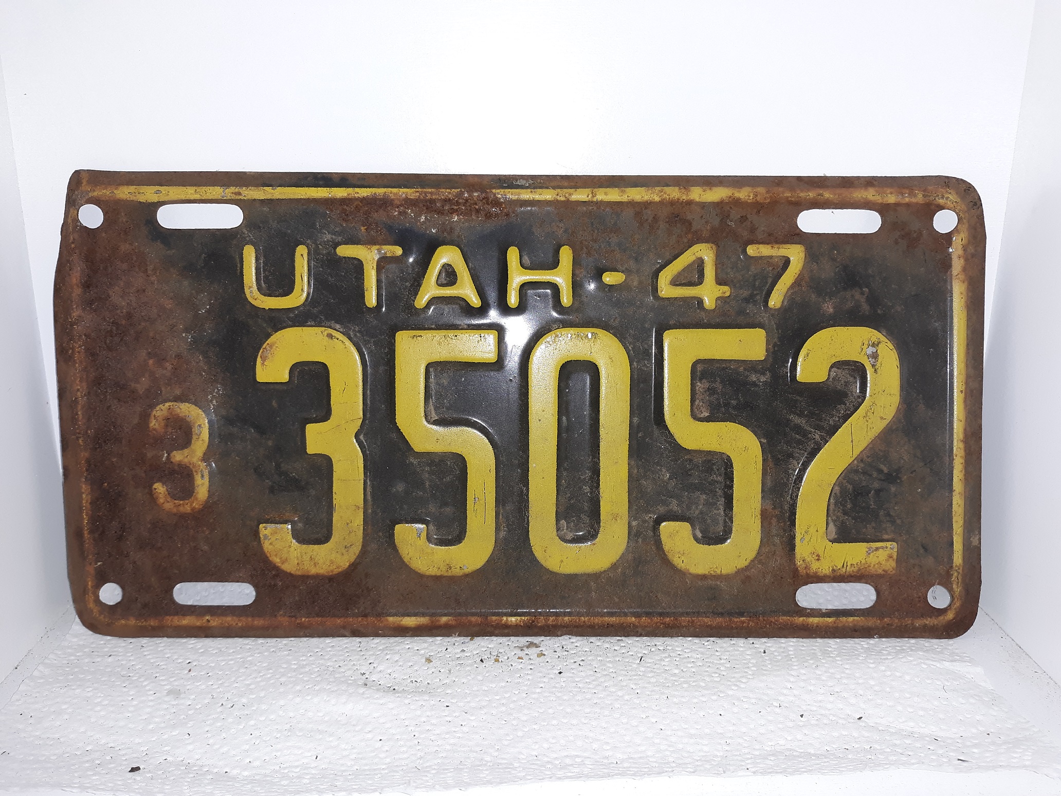 Old and rusted license plate from Utah in 1947, numbered 335052. Black with lots of rust…………………v120 Bx1580B