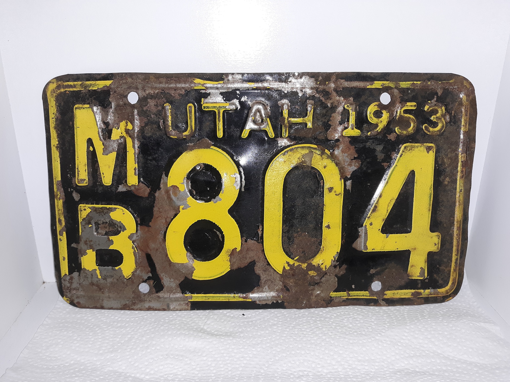 Old and moderately rusted, black license plate from Utah in 1953, numbered MB804. The plate has splotches where the paint has been scraped off, and some rusting………………..v120 Bx1580B