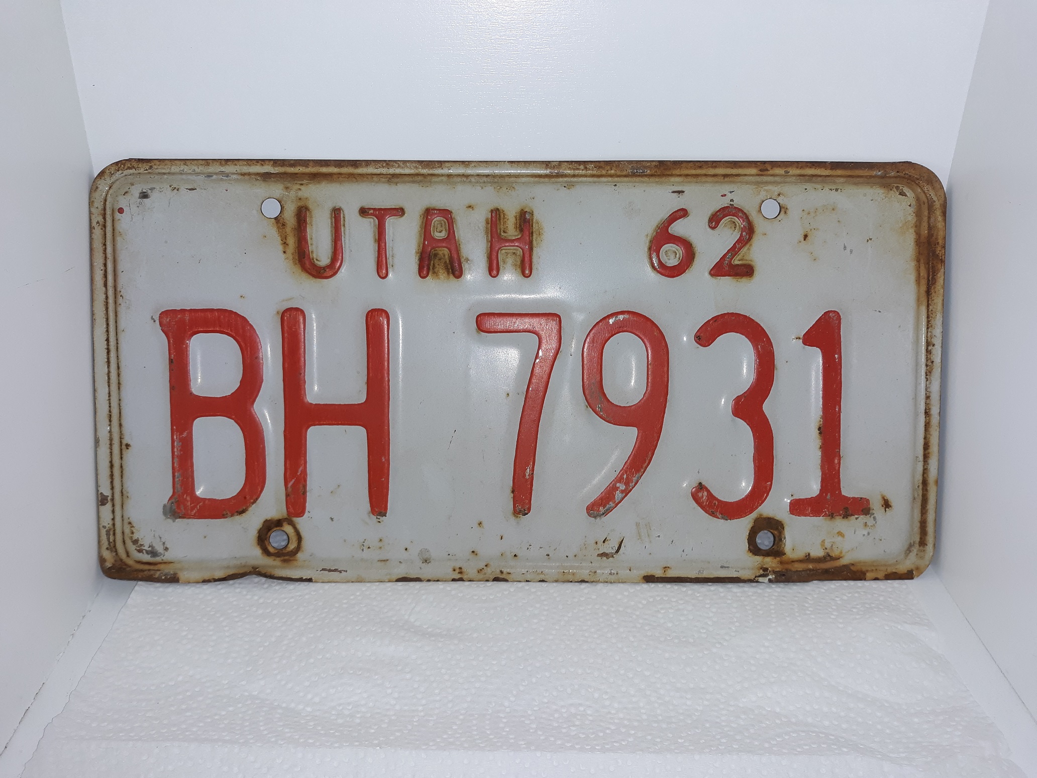 Old and slightly rusted, white license plate from Utah in 1962, numbered BH 7931. The plate has bent edges, and some minor rusting at the edges……………..v120 Bx1580B