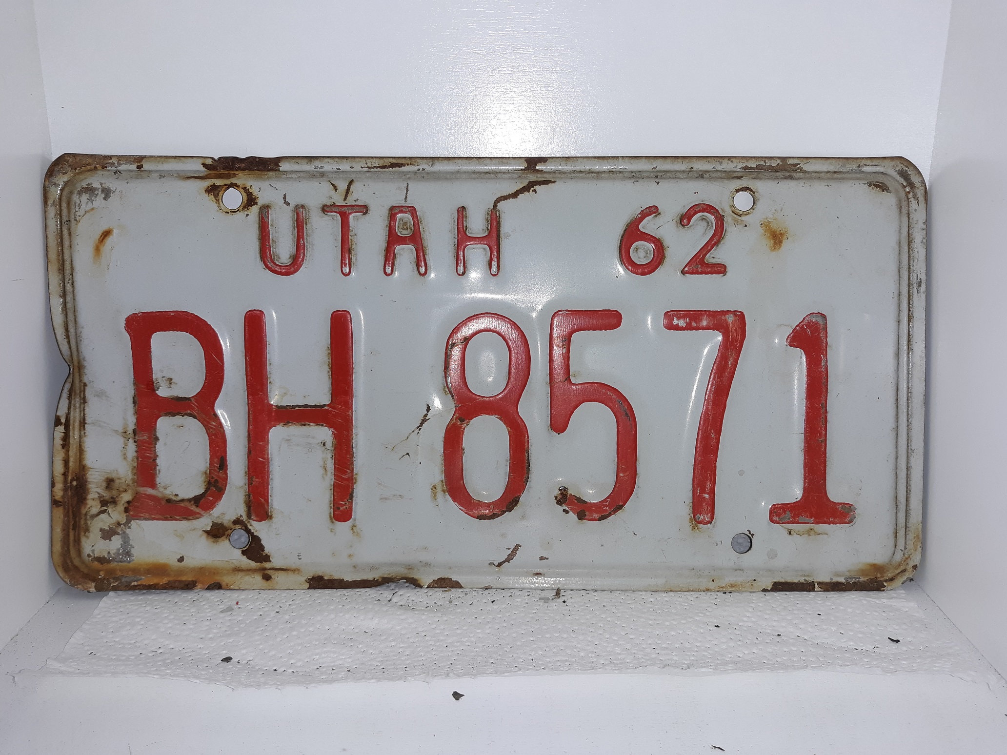 Old and rusted license plate from Utah in 1962, numbered BH 8571. White with bent corners and some rusting and scratches………………..v120 Bx1580B