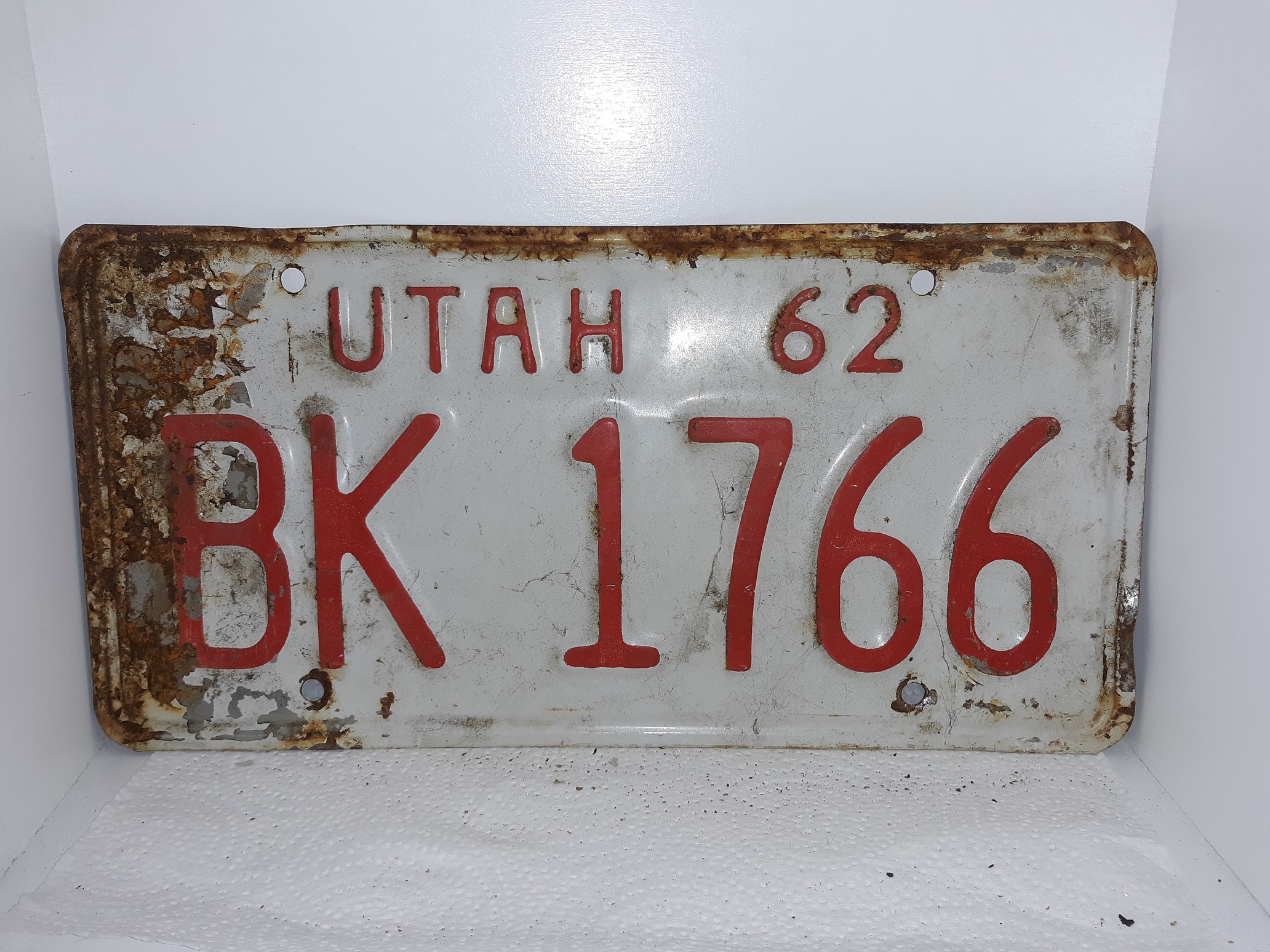 Old and rusted license plate from Utah in 1962, numbered BK 1766. White with heavy rusting on one edge, and some moderate rusting on the other edges……………………..v120 Bx1580B