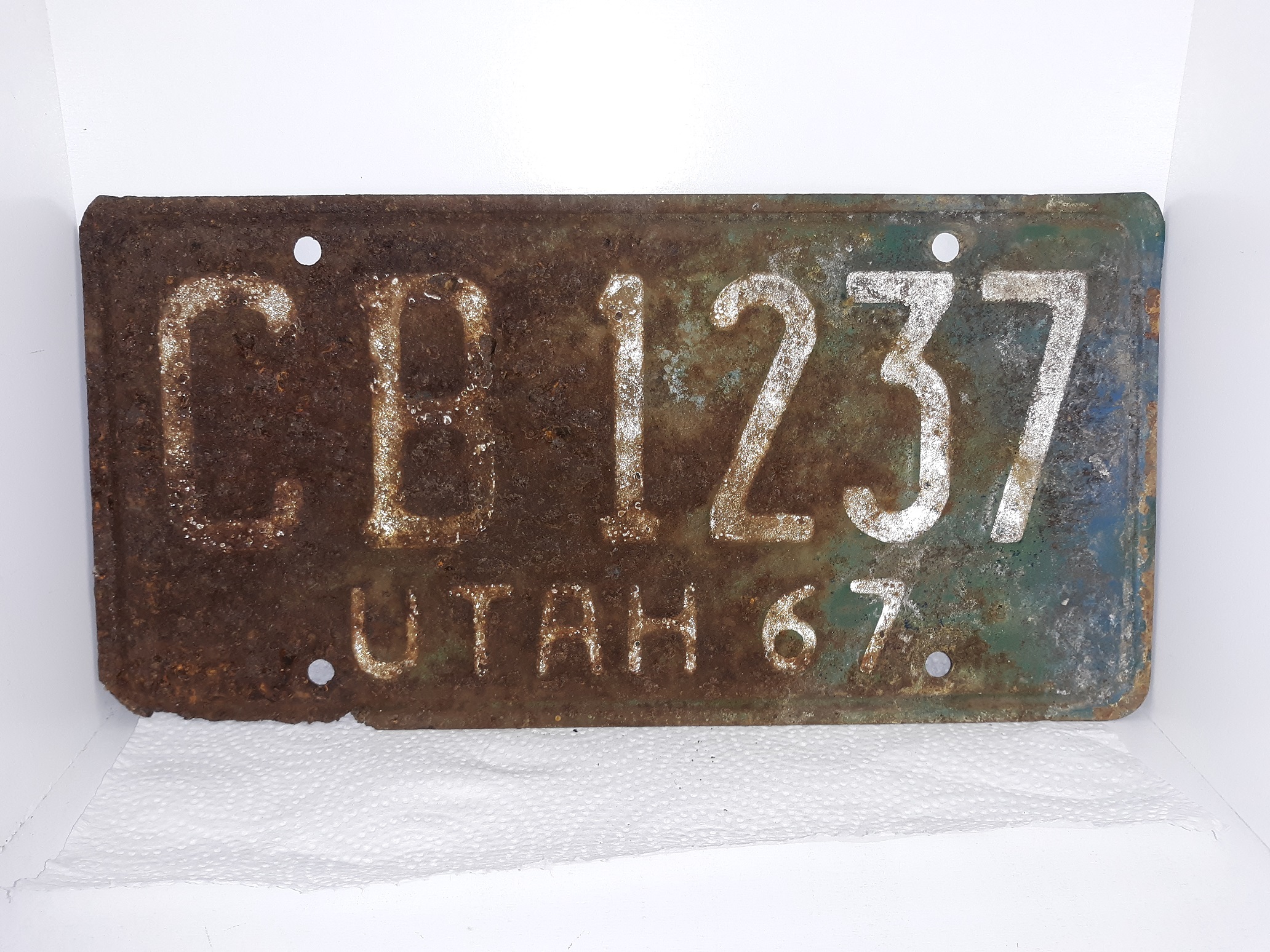Old, extremely rusty, light blue license plate from Utah in 1967, numbered CB 1237. 2/3 of the plate are coated in rust, while the final third is partially rusted over………………v120 Bx1580B