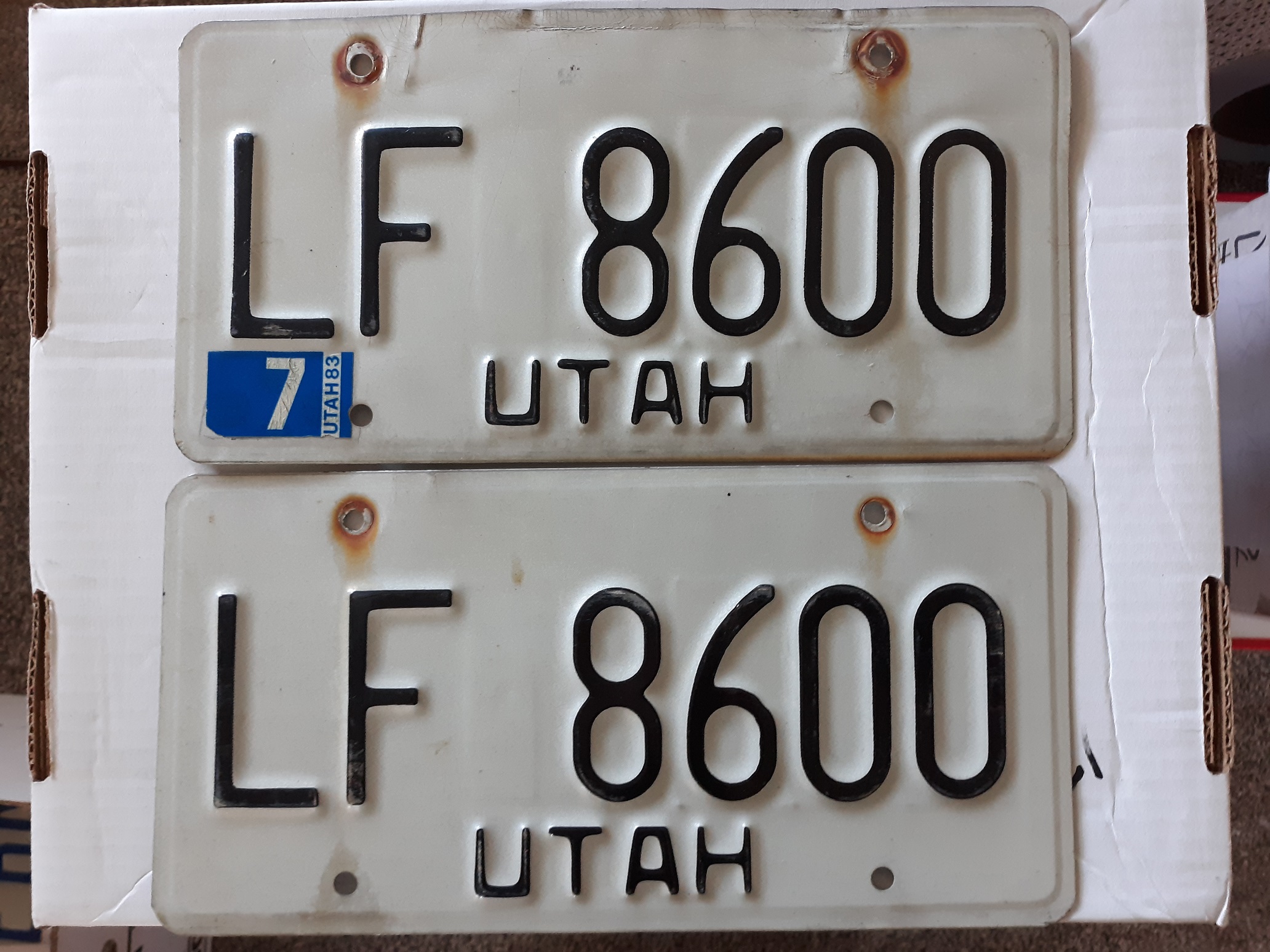2 fair-good condition, license plates. The plates have rust, scuffs, scratches, are wrinkled, and have some stains.