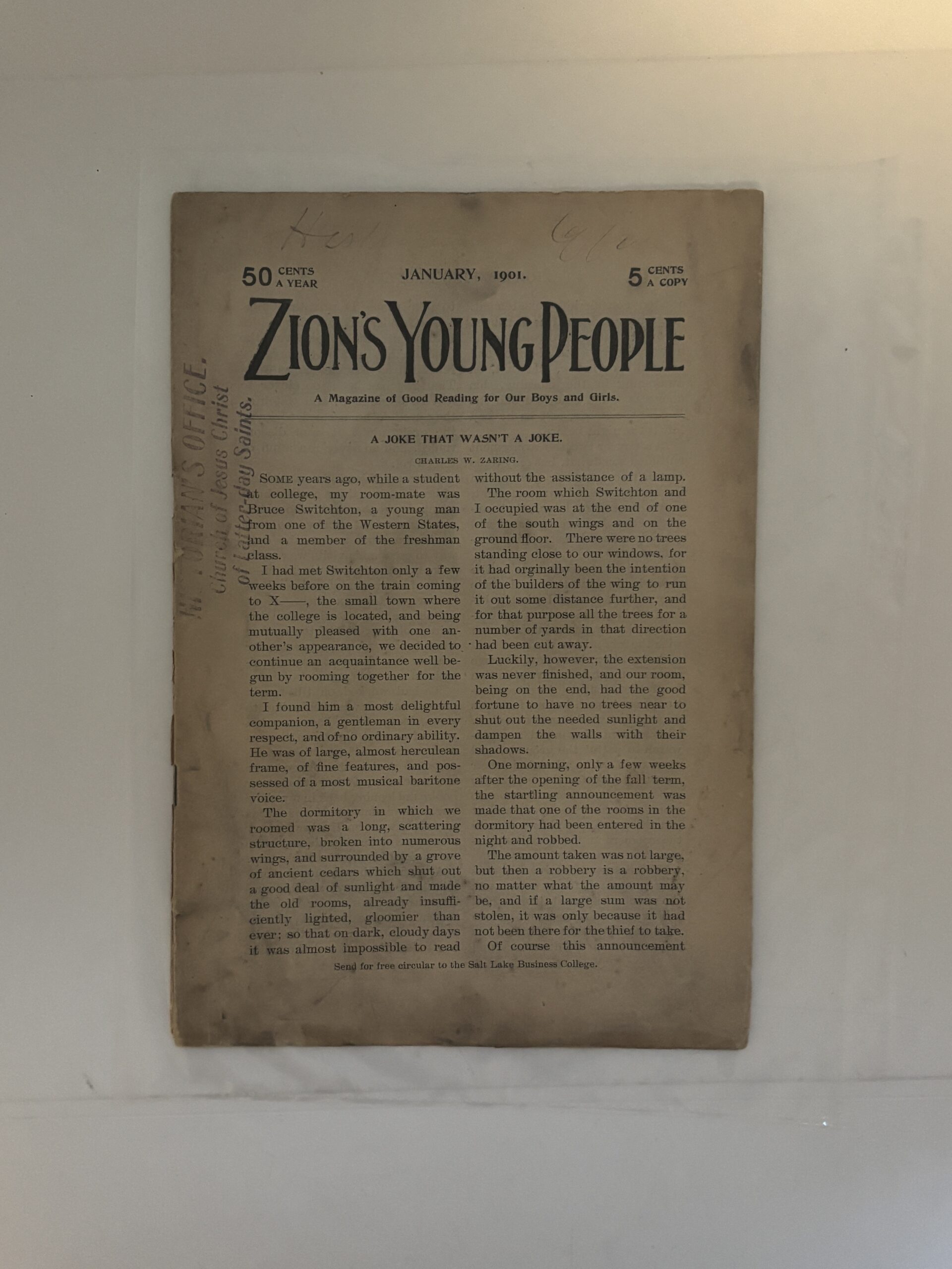 Fair condition, thin, tan, staple-bound softcover. The cover has some stains, creases, and scuffing. Stamp and writing on the front. Text and illustrations throughout are clean, clear, and legible. In sheet protector