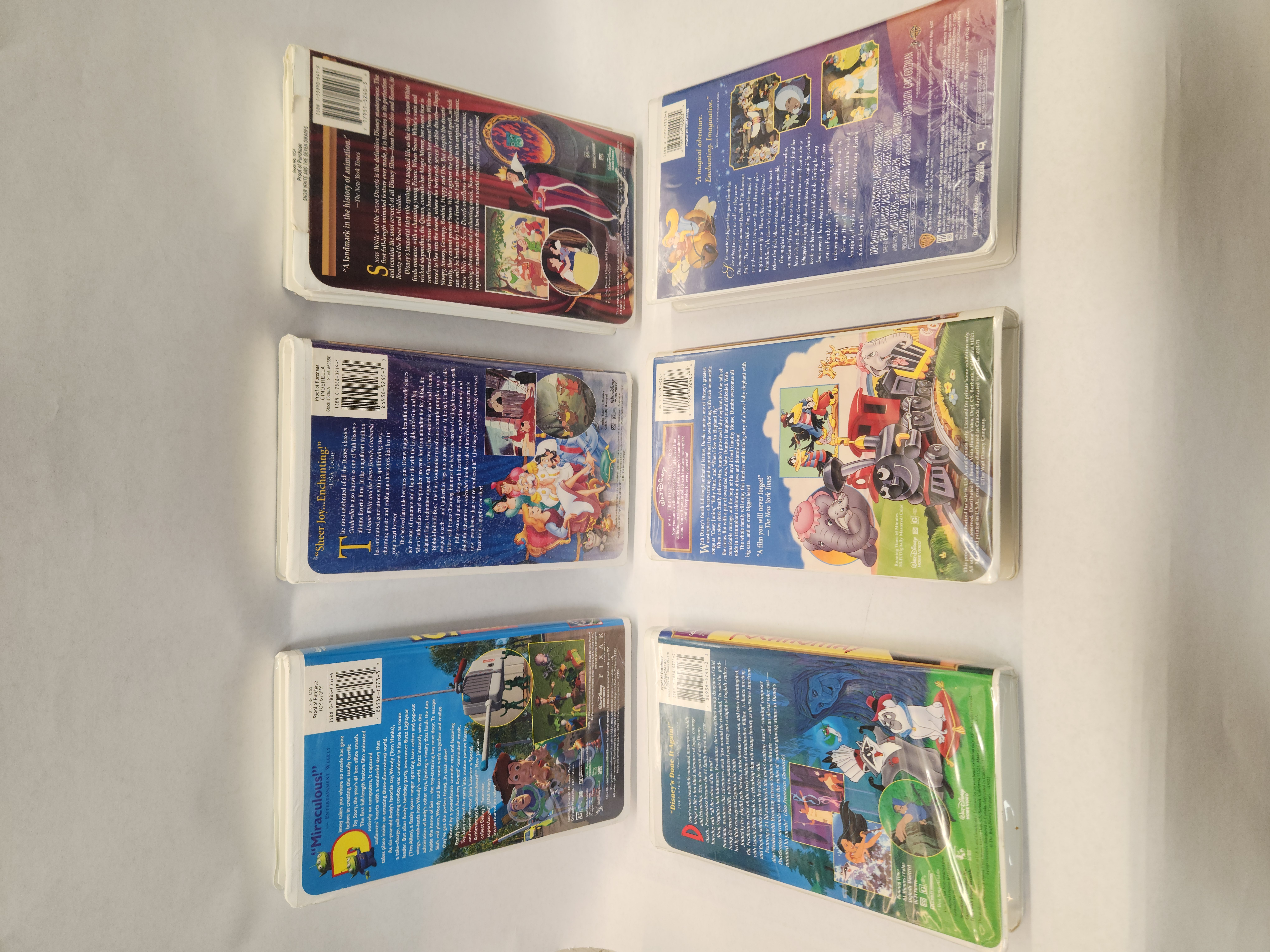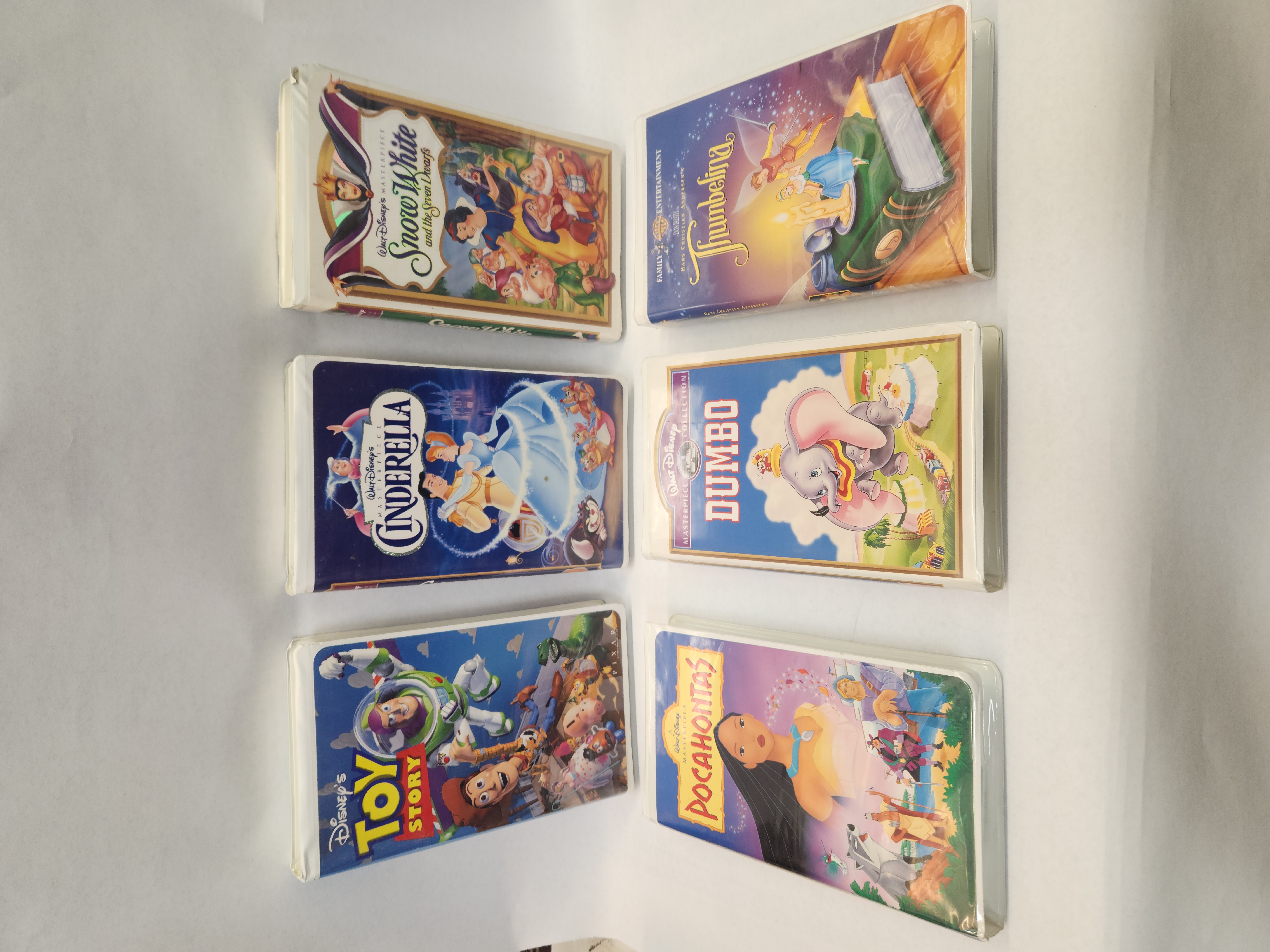 6 VHS Bundle:: Pocahontas, Dumbo, Thumbelina, Snow White and the Seven Dwarfs, Cinderella, Toy Story (Hard Plastic Covers) The cases all show some wear with light scratch marks, slight wear to corners/edges, and dents. The Snow White and the Seven Dwarfs case has a tear on front cover upper right corner. Snow White, Pocahontas, and Dumbo have a Disney Home Video sticker on the bottom edges.