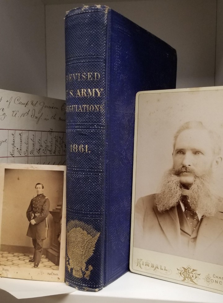 There are two photographs and a paper that is “No.2 Abstract of charges to Enlisted men of….on Muster Rolls of July and August 1869 for Camp and Garrison Equipage, for which….. Leut Col. J F. Grimes…is responsible in the month of August, 1869.”