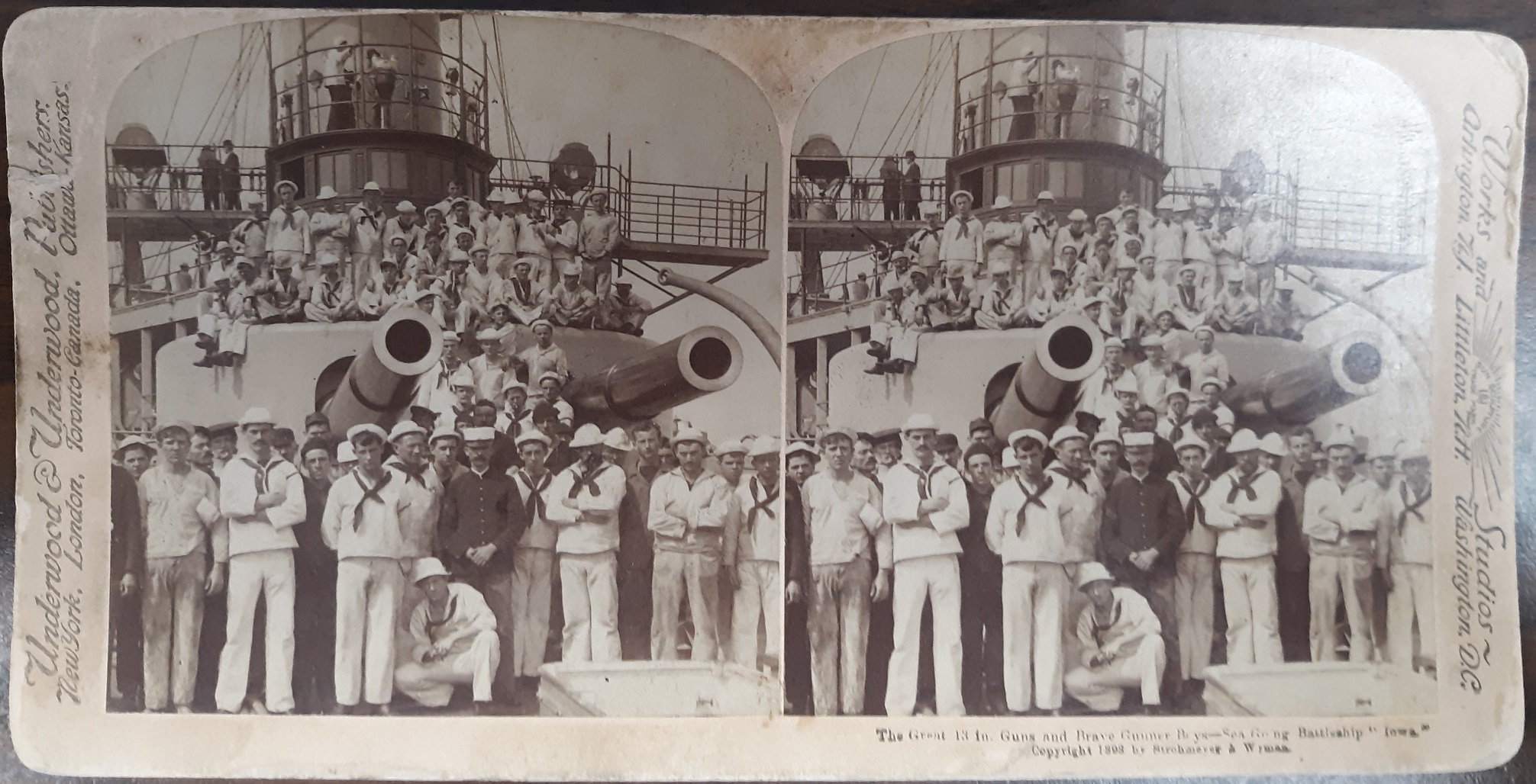 Underwood & Underwood Publishers Stereoview Card by Strohmeyer & Wyman: The Great 13 in. Guns and Brave Gunner Boys—Sea Going Battleship “Iowa”