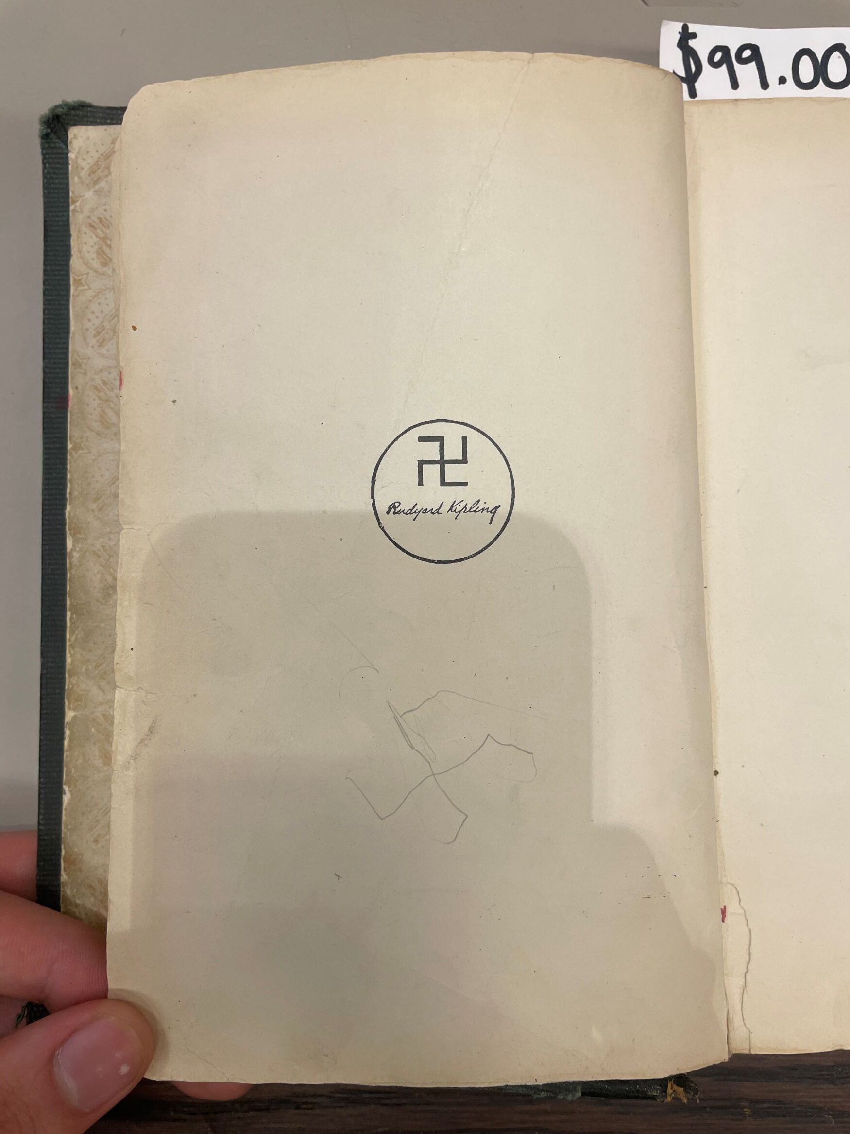 Printed swastika on page 4 (see images), torn pages that have been taped together, with many pages that have creases from folding. Front cover is loosely attached to the spine, and there is some spine damage. The cover is very worn, and the corner edges are bent.