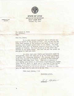 This letter is to a Utah man returning home after the war. It is dated January 26, 1946. Signed y Herbert B. Maw, Governor.