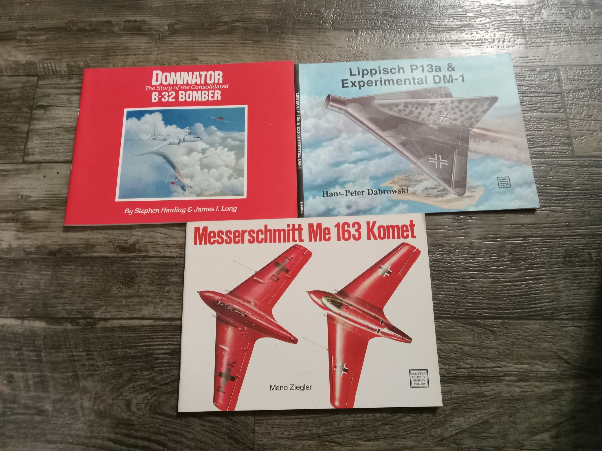 3 good condition, thin, oblong, staple-bound softcovers. The covers will have some scuffing, white marks, and some pen marks. The title page of Dominator: The Story of the Consolidated B-32 Bomber has writing in pencil. Text and illustrations throughout are clean, clear, and legible.