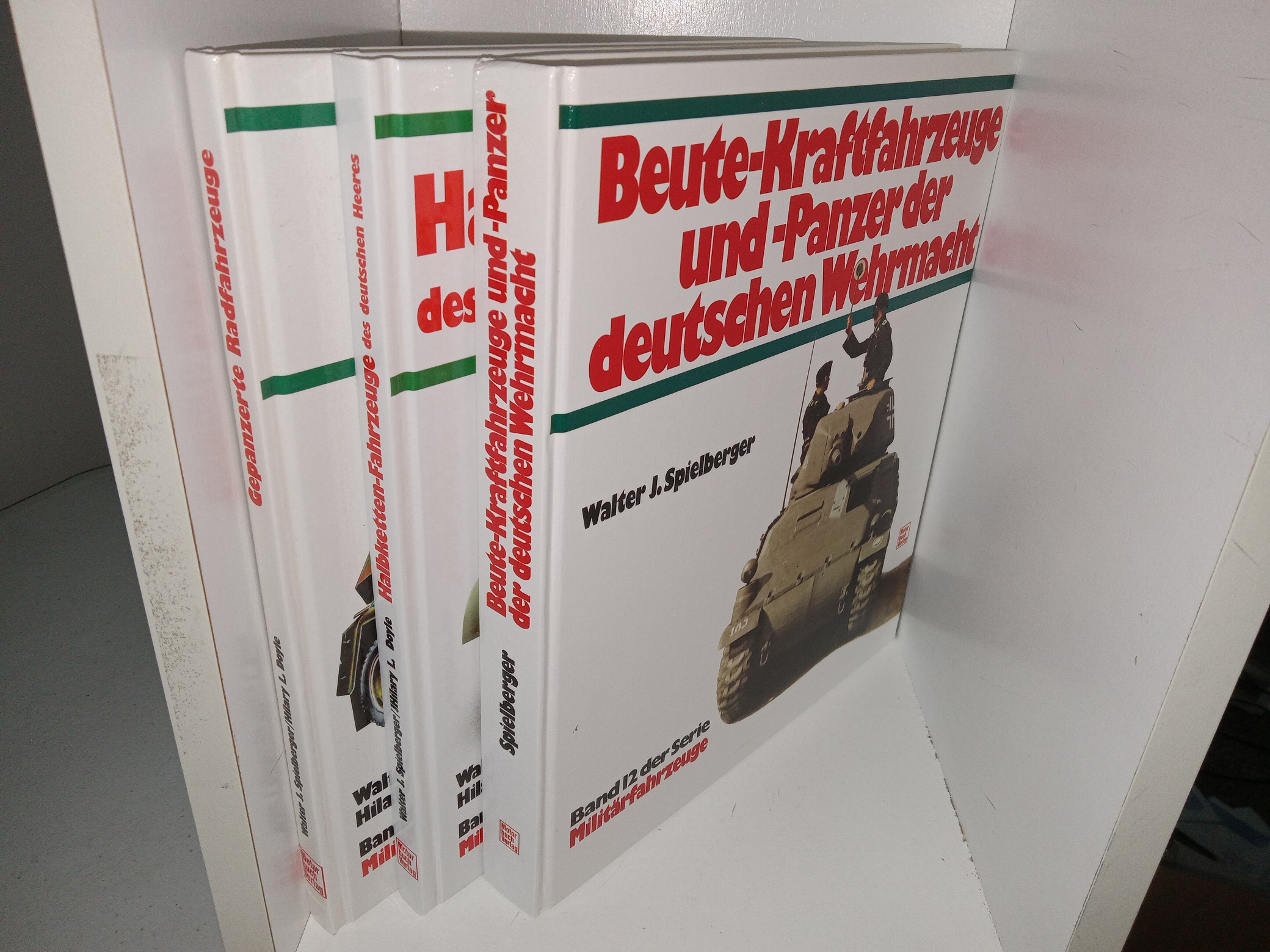 3 good condition, large, white hardcovers with no dust jackets. The covers have some scuffing, and some slightly crushed corners. The front flyleaf of Beute-Kraftfahrzeuge und-Panzer der Deutschen Wehrmacht has some writing in pencil. Text and illustrations throughout are clean, clear, and legible.