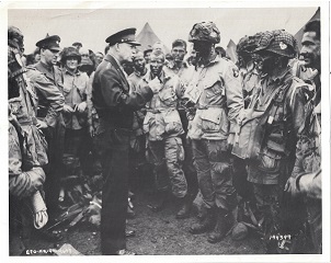 Reprint of a photograph of General Dwight D. Eisenhower addressing D-Day troops.