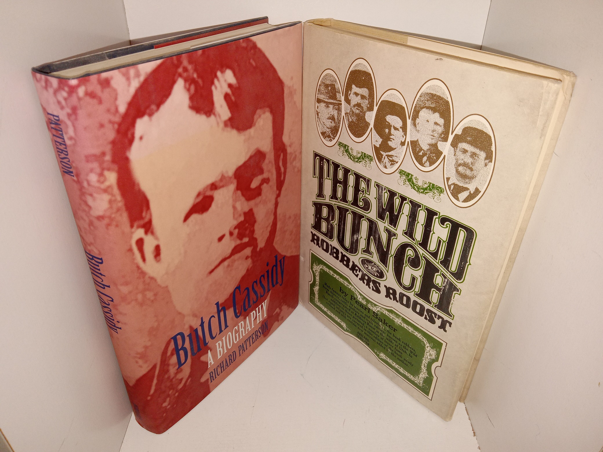 2 good condition hardcovers with dust jackets. The dust jacket of The Wild Bunch: Robbers Roost has small tears, heavy scuffing, fading, wrinkling, and stains, and the top corner of the front inside flap has been torn off. The dust jacket of Butch Cassidy: A Biography has scratches and scuffing. The covers have some bent corners and scuffing. The front flyleaves have writing in pencil and eraser marks. Text and illustrations throughout are clean, clear, and legible.