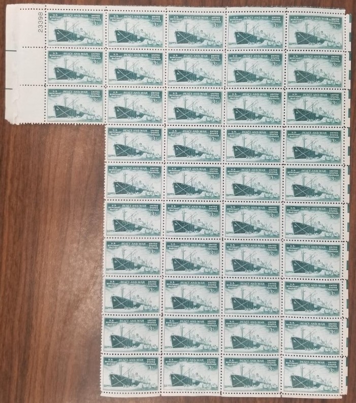 This sheet of 43 Merchant Marine “Peace and War” Stamps is like brand new. The stamps are all unused!