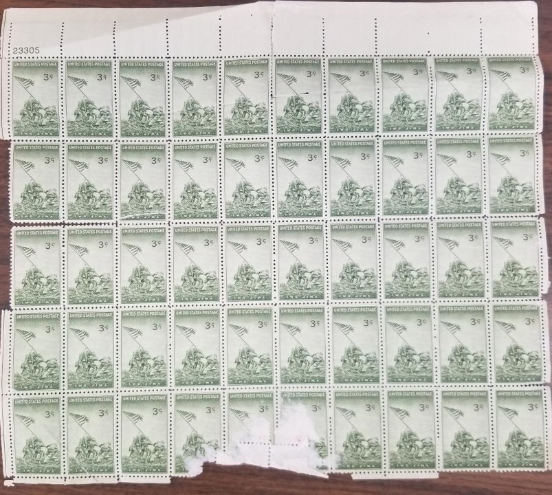 This is a sheet of fifty stamps; all 3 cent Iwo Jima stamps; unused, but some are damaged, as you can see in the photograph.