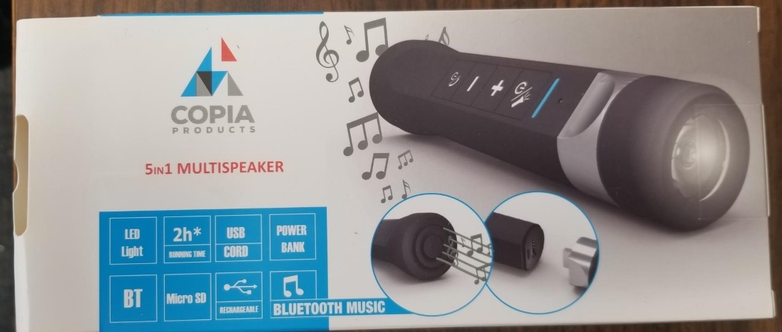 / Copia Products — 5 in 1 Multispeaker — Wireless Speaker Flashlight Charger — Model No.: CPSP-001-BLK — 810190031940