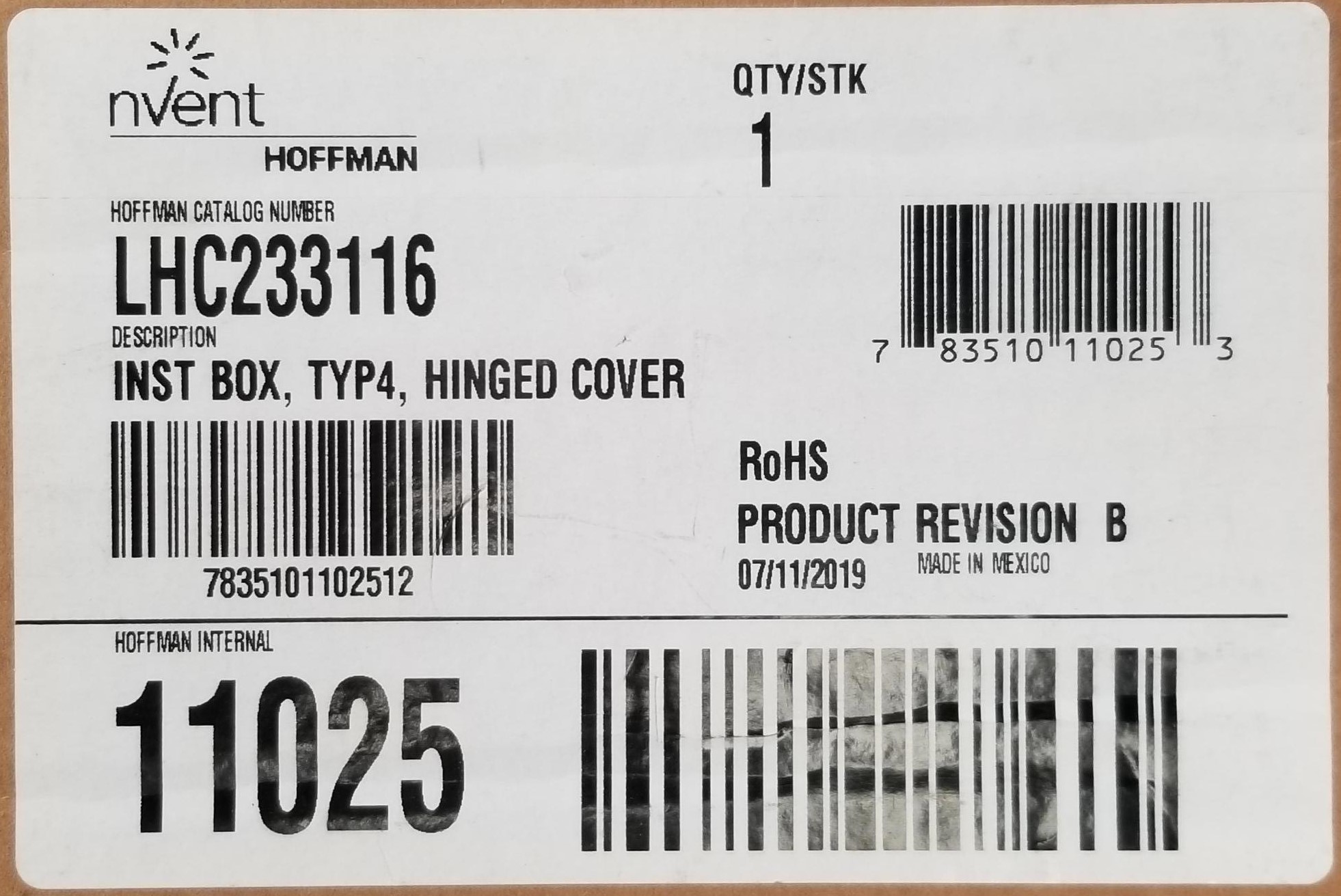 NVENT HOFFMAN LHC233116 Inline Landscape, Type 4, Revision B nvent hoffman catalog number LHC233116 Inst Box, TYP4, Hinged Cover RoHS Product Revision B. Made in Mexico. Hoffman Internal 11025 783510110253