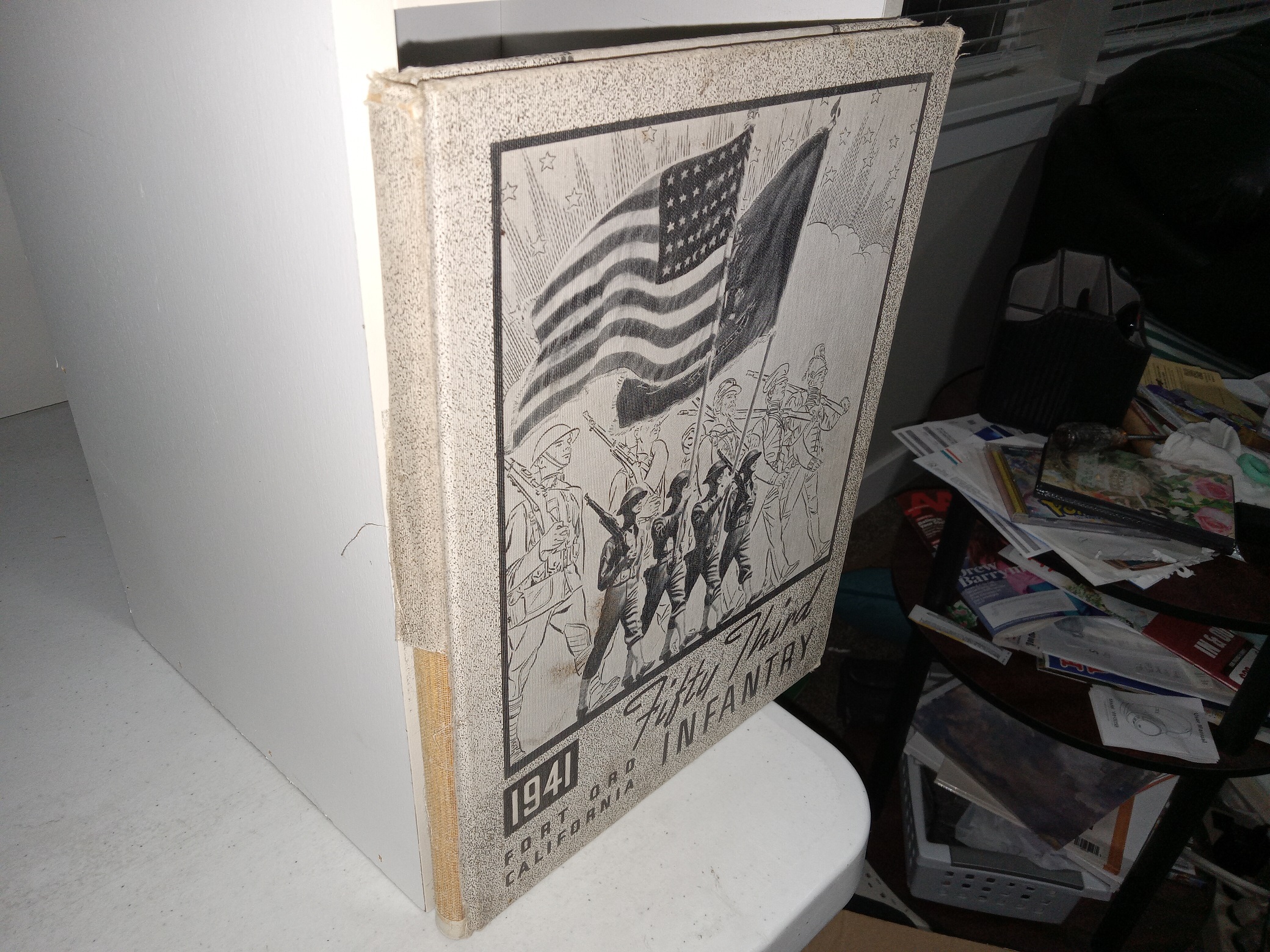 Fair condition, large, gray hardcover with no dust jacket. The cover has tears, fraying, a large piece torn off of the spine, and stains. Some pages have marks or writing in pen or pencil, or stains, but the text and illustrations throughout are clear and legible.